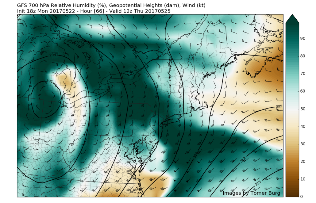 Most of the area saw a rather damp and dreary start to the work week today as areas of moderate to heavy rainfall moved over portions of the Mid-Atlantic and Northeast. This is due in part to a large upper level system over the central part of the country that will be gradually strengthening and progressing eastward over the rest of the week. This should allow for more damp and unsettled conditions down the line, especially on Thursday and Friday. A break from this pattern may be possible by the time we reach the Memorial Day Weekend, but this will all depend on the evolution of the previous systems this week.