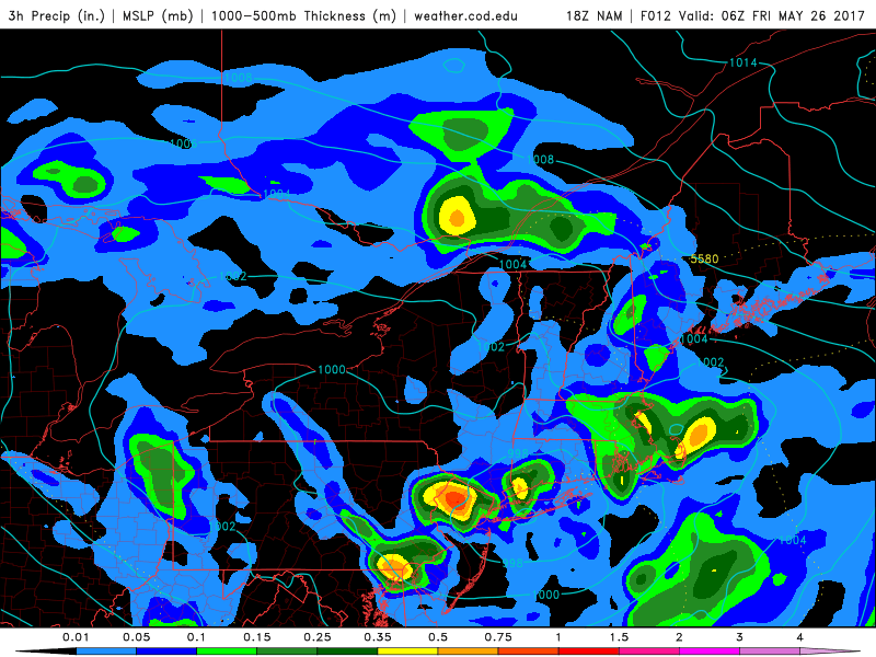 NAM model showing showers and thunderstorms associated with 996mb low over Long Island later tonight