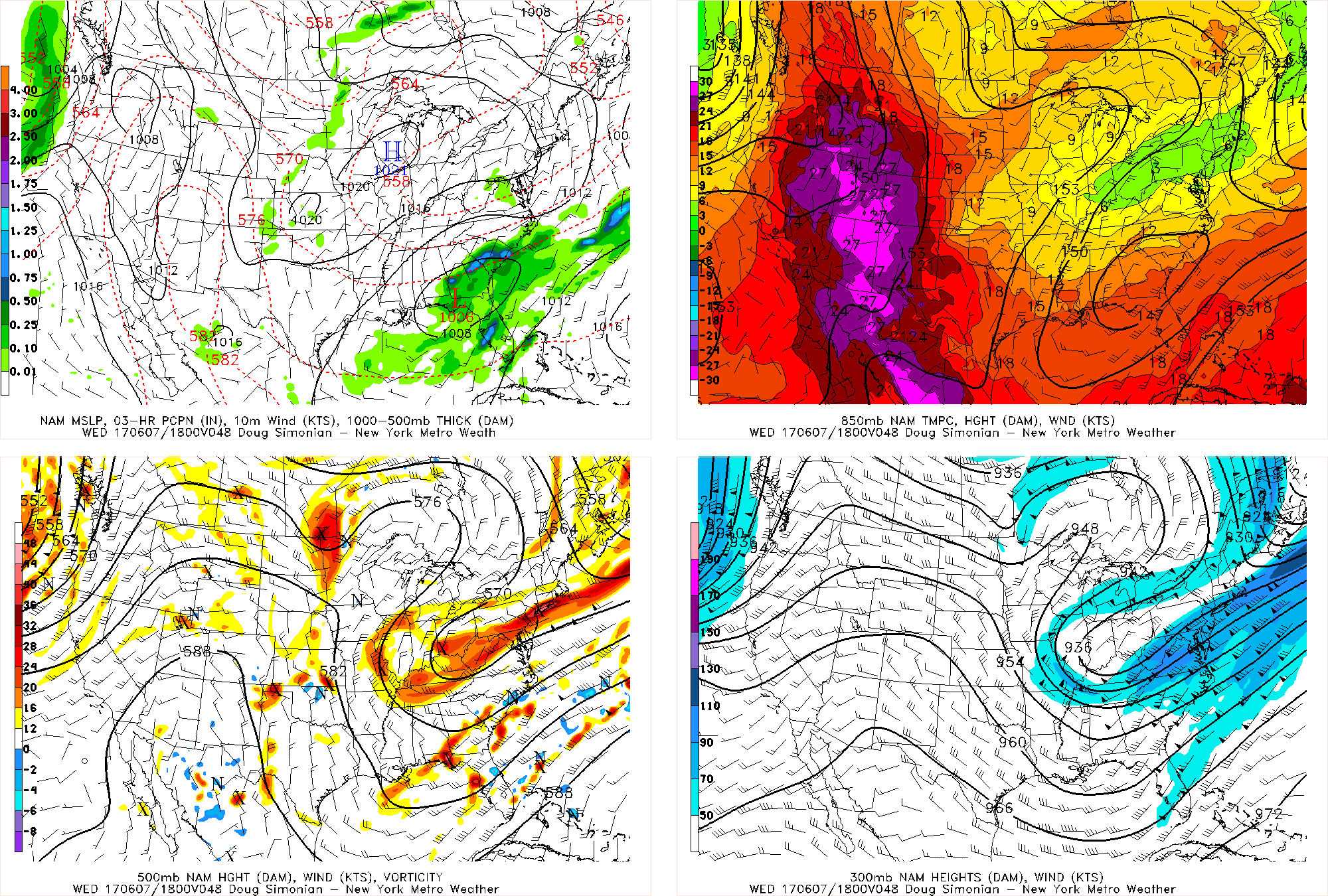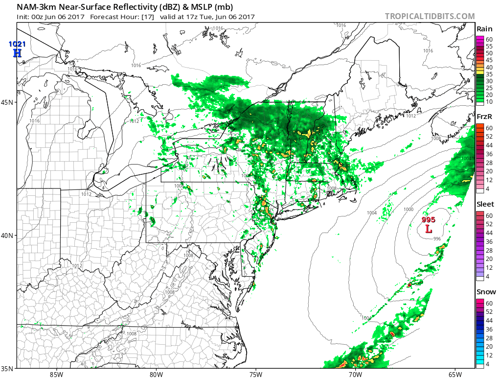 Monday night’s 3km NAM model valid for 1:00pm on Tuesday shows a cluster of showers and thunderstorms in N NJ, moving into NYC (Tropical Tidbits).