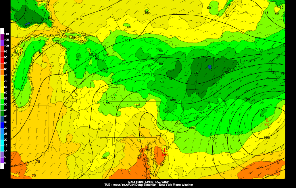 Later Tuesday night, the 500mb low will open up and weaken, and thus coverage of showers and thunderstorms will wane. But continued onshore flow will keep things very chilly. In fact, as the coastal storm moves to our east and northeast winds thus strengthen on Tuesday, temperatures may actually fall throughout the day into the upper 50s — extremely chilly for the middle of the day in June. And on Tuesday night, temperatures will fall into the low to mid 50s, with continued clouds, fog, and drizzle.