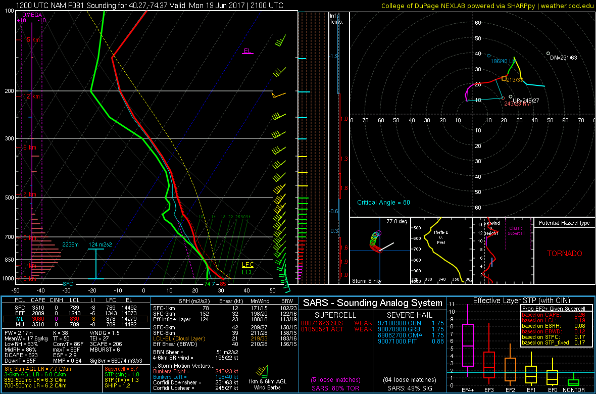 Friday’s 12z NAM model valid for 5:00pm on Monday in Central NJ shows a very favorable forecast sounding for severe weather with low-level rotation and fat CAPE (NEXLAB).