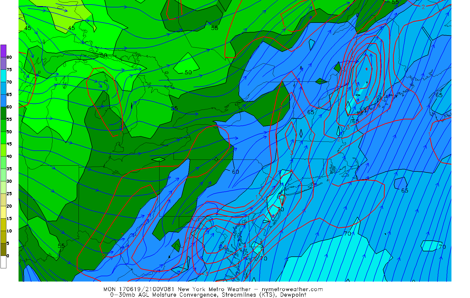 Friday’s 12z GFS valid for Monday afternoon shows very high low-level dewpoints and plenty of moisture convergence over the area, a good indicator for training bands of heavy rain.