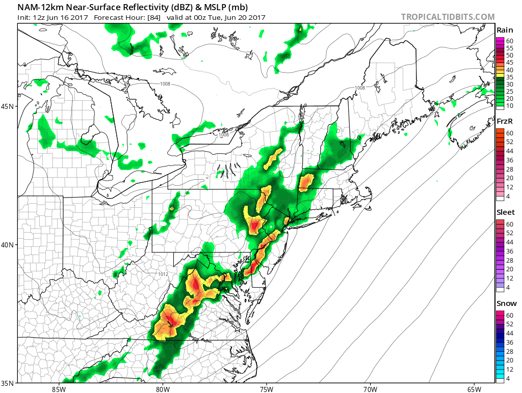 If this were to happen, there would be a severe weather threat with severe wind gusts, 1″ hail, and an isolated tornado — the SPC has a 15% (slight risk) out for the area on Monday. We are still leaning against a true “severe” weather threat and instead think this will be mainly a day with clusters of thunderstorms with heavy rain and some wind gusts up to 40mph with perhaps a shelf cloud somewhere — but if the NAM model were right, the severe threat would need to be taken more seriously. We’re not sure if the NAM’s “fatter” CAPE makes sense given the lack of an EML. But considering the trend has been to slow down the cold front thanks to the large West-Atlantic ridge and the fact that a slower cold front could mean more time for true instability to build due to more sunshine, and some of the ideas from the NAM cannot be ruled out.