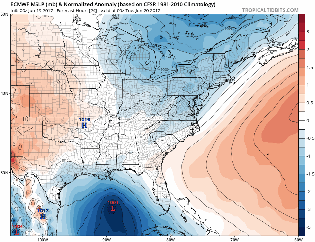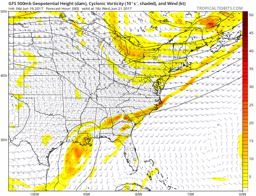 More ridging is likely to build for over the region Thursday and into Friday, with more sunshine and high temperatures in the lower to middle 80s once again. However, we will be watching a tropical disturbance that will moving from Northwest Caribbean into Gulf of Mexico this week. This disturbance is being monitored by National Hurricane Center, for possible tropical or sub-tropical storm formation and could impact parts of the Gulf coast with some heavy rainfall and gusty winds later this week. An upper-level low over the Western Gulf of Mexico, will likely keep enough shear over this system, over next few days, only allowing for more gradual development into tropical or subtropical cyclone.