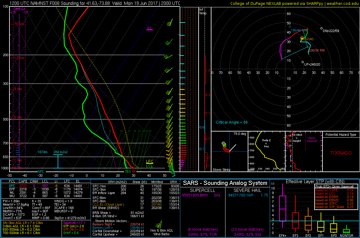 3km NAM sounding late this afternoon from Pougkeepsie,NY, showing high SBCAPE winds veering with height and low LCL heights supporting weak supercell tornado.