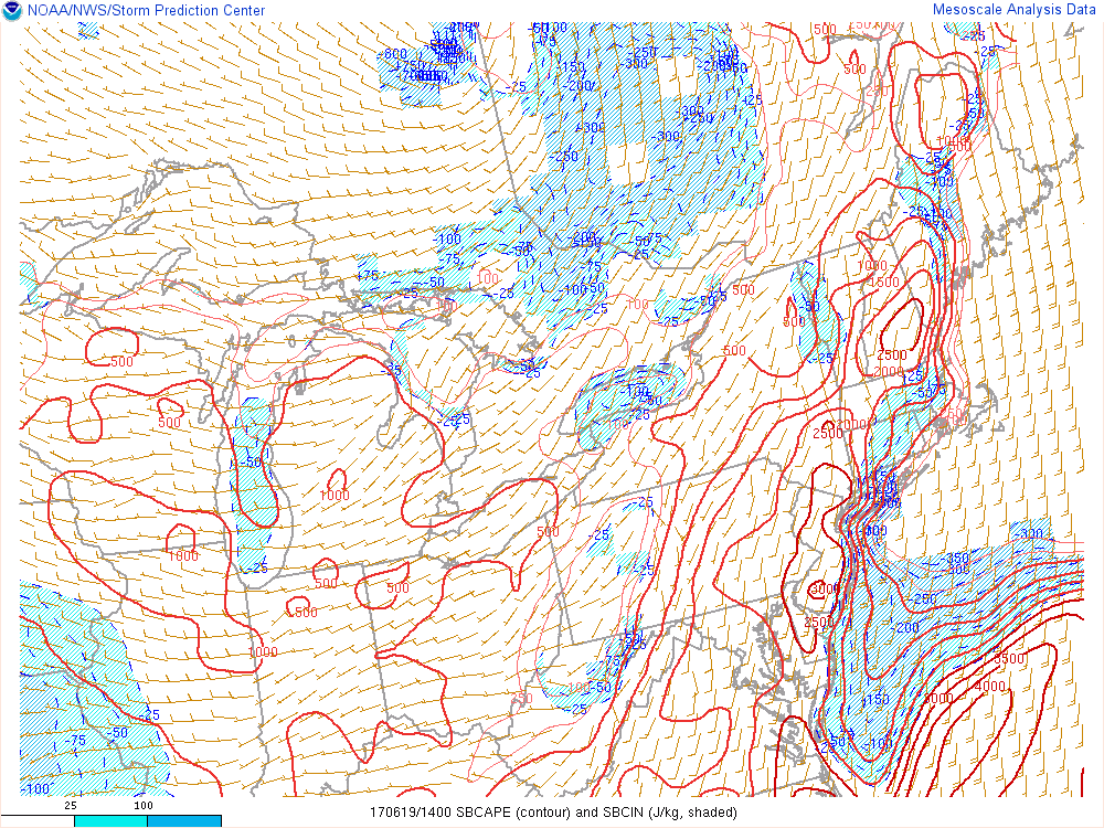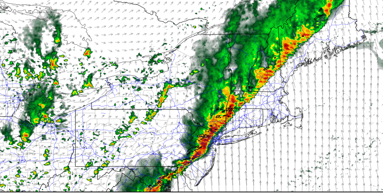 While mid-level lapse rates will be on the weaker side, MLCAPE will be between 1000 – 2000 J/kg and 0-6km bulk shear 30-40kts this afternoon and evening. This will support some strong to severe thunderstorms wind gusts possibly over 50 mph. Damaging straight-line winds will likely be the primary threat. Some large hail can’t be ruled out with high CAPE and shear environment. But this threat is reduced somewhat by high freezing levels and a lack of dry air in the mid-levels of atmosphere. There is also a threat some discrete supercells, ahead of the main line, that produce taller updrafts with larger hail. Some weak tornadoes are possible from these supercells , with low-level winds backing along the pre-frontal trough and low LCL heights, especially over parts of the Northeast Pennsylvania , Lower Hudson Valley and Northwest Connecticut.