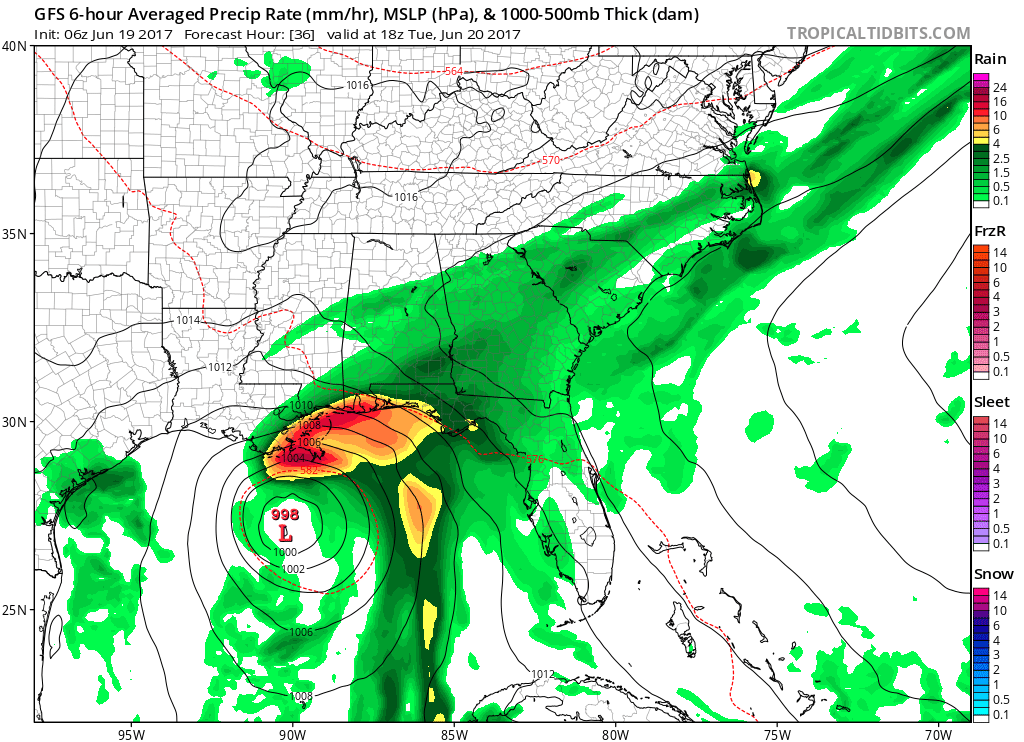 GFS model showing tropical or sub-tropical system impacting the Gulf coast with some heavy rain by Tuesday