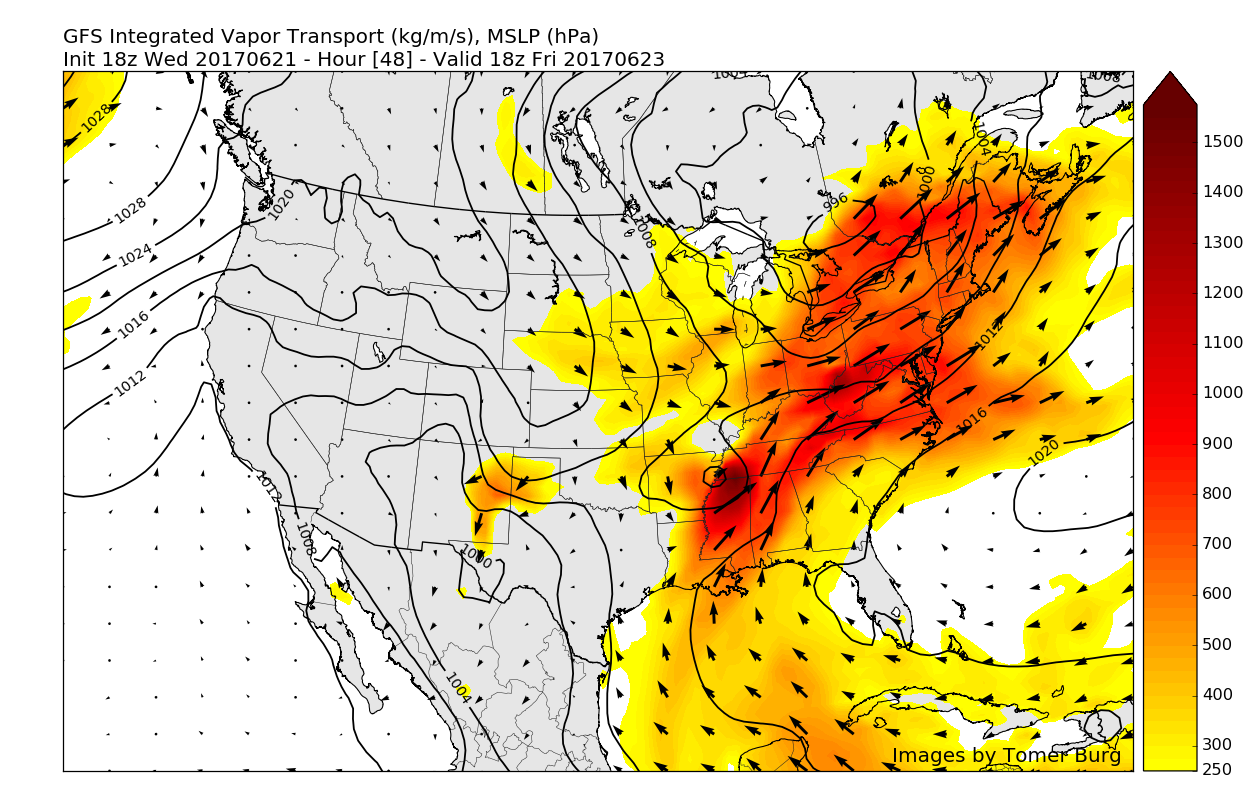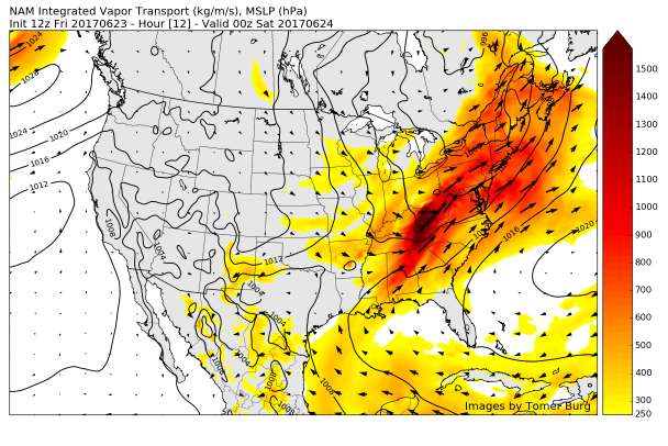 As we head into tomorrow morning, things look to remain quite unstable as the energy from the remnants of Cindy approaches the area while the cold front to our east compresses all of the rich tropical moisture into a focal point, located right over our area. During the day today, the high resolution models have been keying in on a very heavy band of rain moving over portions of Pennsylvania, New Jersey, New York, and Connecticut by 7-10 am tomorrow. This band of heavy rain is directly associated with a mid level piece of energy currently located over portions of Kentucky, which will likely continue NE throughout the evening hours. A crucial point here is that since the energy already exists and is well sampled, the models likely have a decent grasp on the situation over the next 12-18 hours. Regardless, as this piece of energy nears our area tomorrow morning, we will have to monitor the situation very closely since any rainfall with this system will likely be quite intense, which could produce localized flash-flooding, and exacerbate and potential flooding issues caused by tonight’s storms.