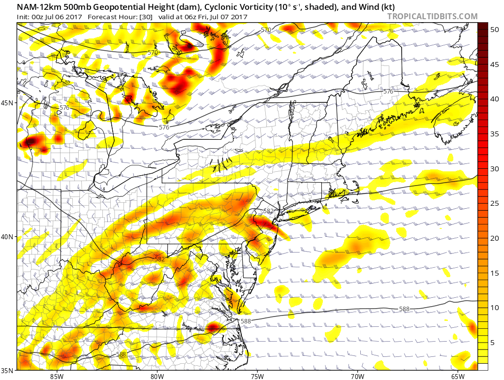 Mid level atmospheric disturbances approach the area starting Thursday, with a  significant one nearing the Northeast states by Friday morning.