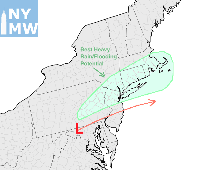 Figuring out exactly where the boundary will set up will be quite a task, but we have begun formulating our best ideas at this current stage. Weighting high resolution forecast models along with ensemble guidance, the thermal gradient seems likely to set up in a position from Eastern PA through NJ and towards Long Island. With the heaviest rain just north of there, it appears likely that Central and Northern NJ, NYC, LI and parts of Southern New England will see the potential for torrential rains and localized flooding through Friday morning.