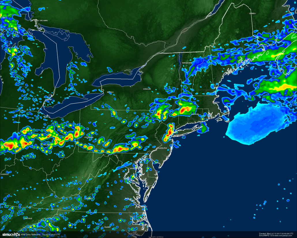 As we stated earlier this week, conditions were once again going to become unstable as a deep tropical airmass works its way over the region over the next few days. This was quite noticeable today as dew points rose into the uncomfortable (66-70) and oppressive (71-75) degree ranges! Coupled with highs in the mid to upper 80’s, heat indices were able to climb into the middle 90’s in some locations, promoting the issuance of a Heat Advisory for counties in Pennsylvania, New Jersey, and New York-for now. A Heat Advisory is issued when the combination of heat and humidity is expected to make it feel like it is 95 to 99 degrees for two or more consecutive days, or 100 to 104 degrees for any length of time.-NWS
