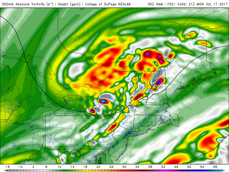 Mid level vorticity and height show a very notable disturbance moving through New England on Monday, the impetus for the development of strong and severe storms.