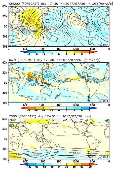 JMA weeklies showing CHI and rainfall convection wth more zonal heights over CONUS during the later half of August.