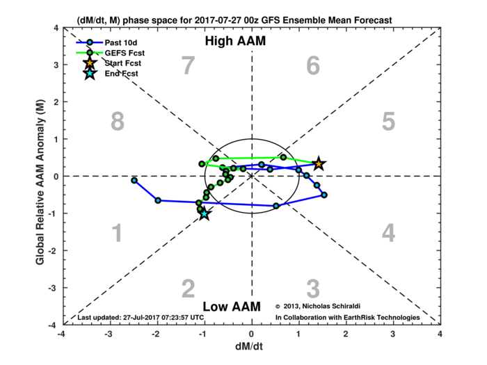 In our premium long-range article, at the end of June, we also discussed about the easterly zonal winds with the QBO descending from 10mb to 30mb and 50mb and how this will affect the MJO. Well the latest monthly QBO (value for June at 30mb -3.18, which is big drop from +8.01 in May. Latest indications show the AAM (Atmosphere Angular Momentum) will also be more negative phase. Research as shown that the AAM and OBO in negative phase has tendency to modulate MJO activity and NAO pattern. Convection and tropical forcing with MJO propagate into the Western Hemisphere and Africa or phases 7, 8 and 1. The NAO is in a more neutral to negative phase during the summer. By the way, if the QBO persists in the negative phase, along with lower solar activity could have major implications for more high-latitude blocking for this winter as well.