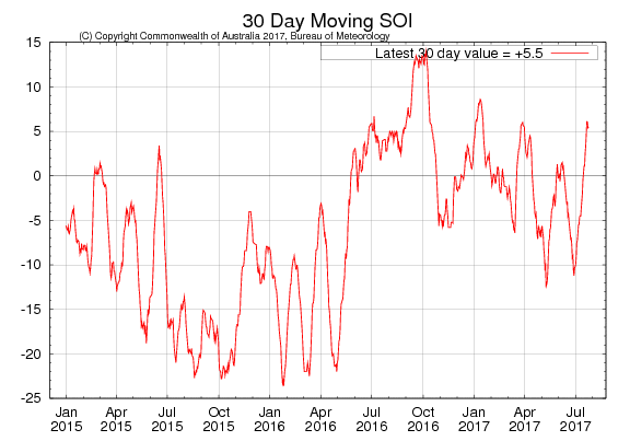 Well, currently it appears ENSO is neutral strictly by definition; using the sea-surface temperature anomalies and the 90-day moving SOI values. Latest model forecasts also suggest sea-surface anomalies in the ENSO regions of the tropical Pacific, will remain in neutral state. More easterly zonal winds near the dateline and rising 30-day moving SOI values into the positive territory, suggest a more weak La Nina-like tropical forcing pattern will predominate, during at least the first couple of weeks of August.