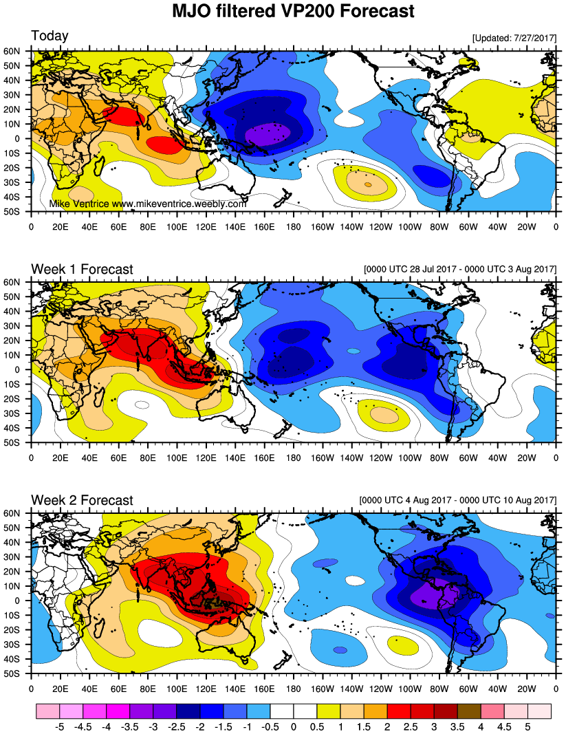 200mb velocity potential anomalies indicate tropical forcing will be shifting the Western Hemisphere during the first couple weeks of August