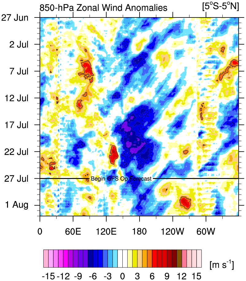 The tropics in the East Pacific and eventually in the Atlantic may heat up with MJO moving into Western Hemisphere by in August. For last couple weeks of this month, more subsidence with the SAL (Saharan Dry Layer) or dust clouds from over Africa, has inhibited more development of tropical waves as move eastward over the Atlantic. A CCKW (Convectively-Coupled Kelvin Wave), forecast during to progress into Atlantic during the first couple weeks of August. This atmosphere feature could provide more favorable unstable and less sheared environment for another tropical system to form. Tropical Storm Don had form earlier in this month, as a weaker CCKW had move through the Atlantic. But the had subcomb to more hostile ennvironment with shear and dry air over the Caribbean Sea.