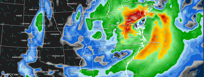 This afternoons ECMWF model showing a rather impressive Nor’Easter for this time of year affecting the Mid Atlantic and portions of the Northeast with heavy rain and gusty winds (Courtesy of Accuweather Pro)