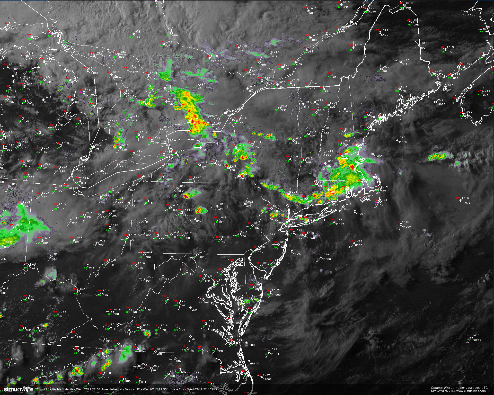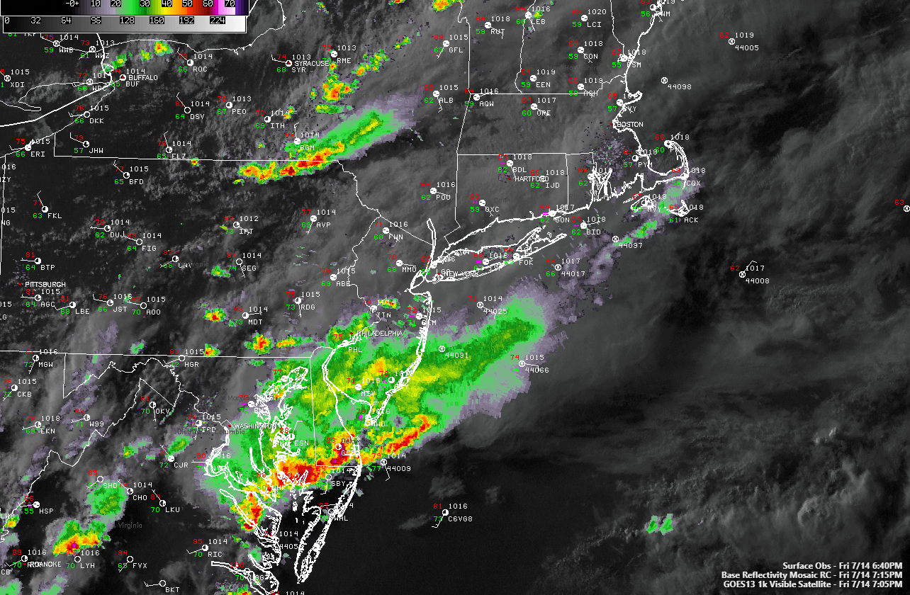 This evenings latest regional radar mosaic, surface observations, and high resolution visible satellite imagery, showing the bulk of the showers and thunderstorms moving off the Mid Atlantic coast (Courtesy of Simuawips)