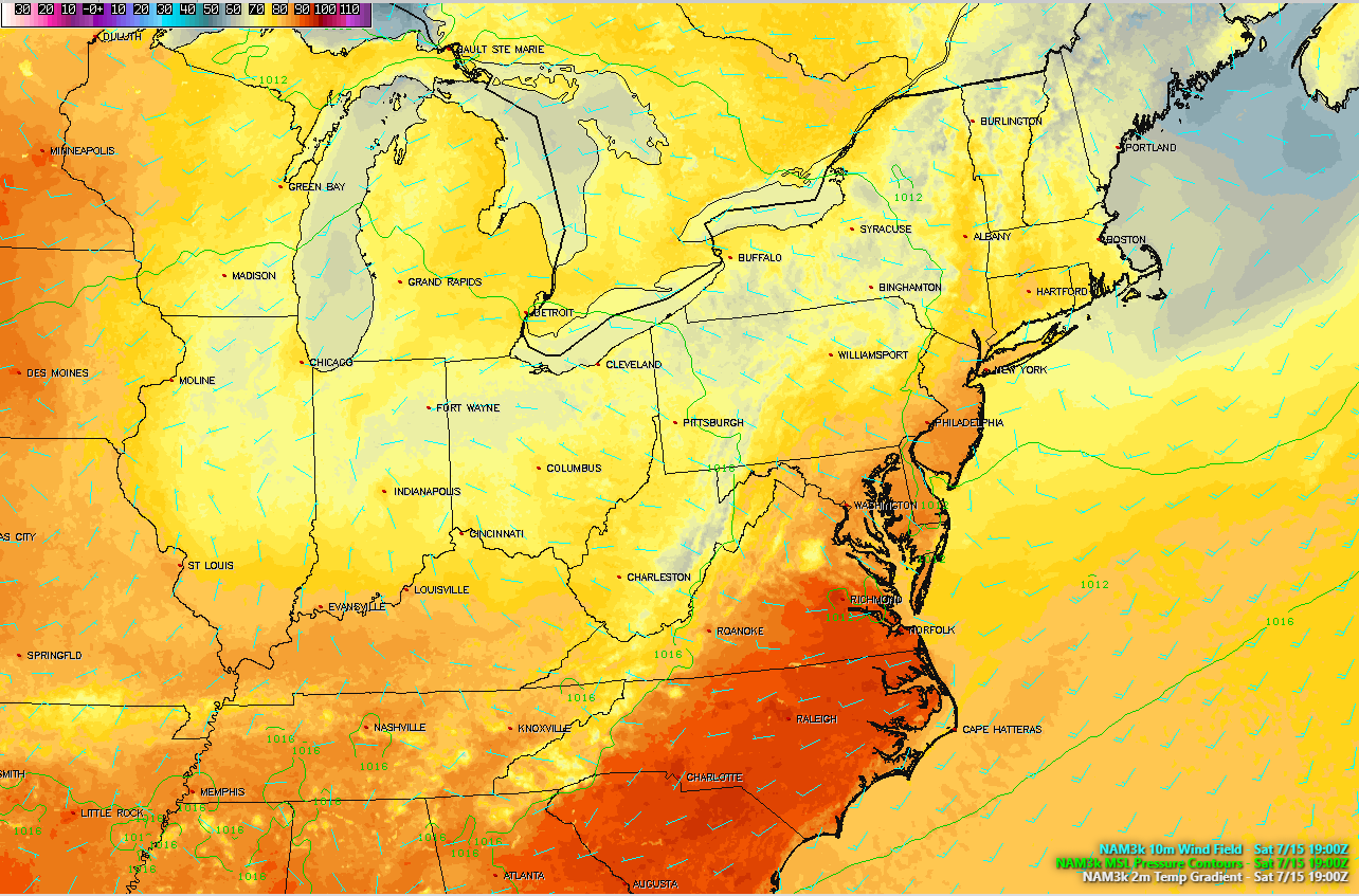 This afternoons high resolution North American Model, showing light northwesterly winds, warm temperatures, and an overall pleasant airmass over the area, which should make for a beautiful day!
