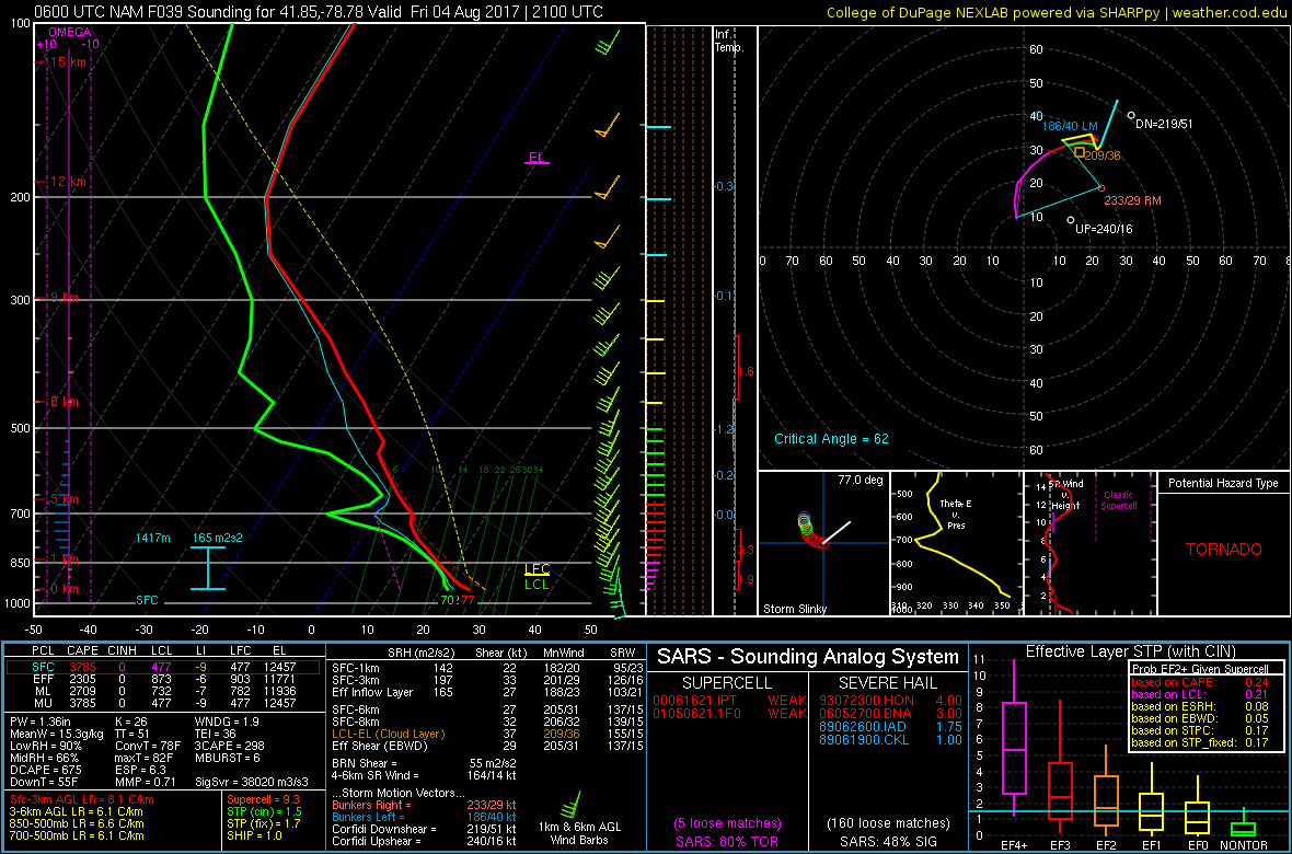 NAM sounding tomorrow over Northwest PA, showing ample instability with CAPES near 3000 joules and winds veering with height, possibly support an isolated tornado risk. But veer-back-veer winds between 500-700mb may prevent a more heightened tornado risk.