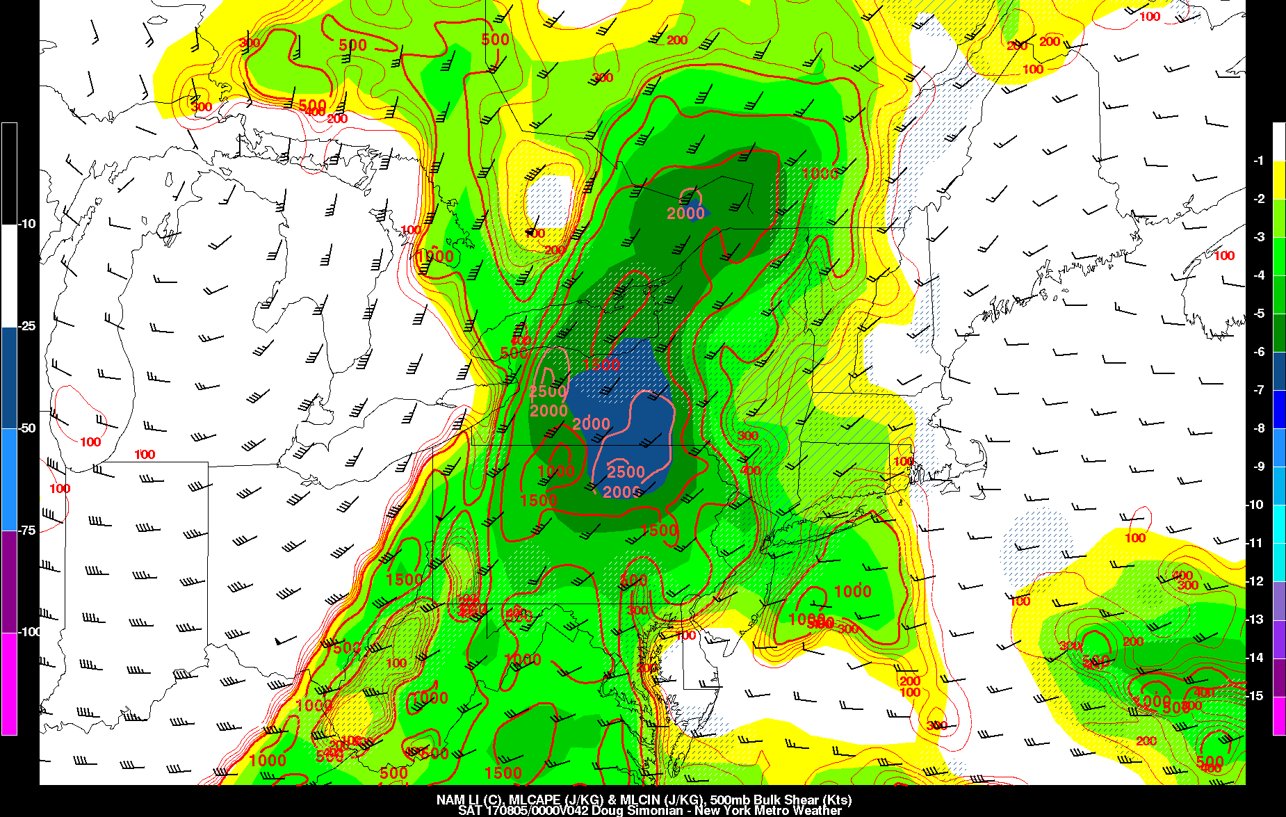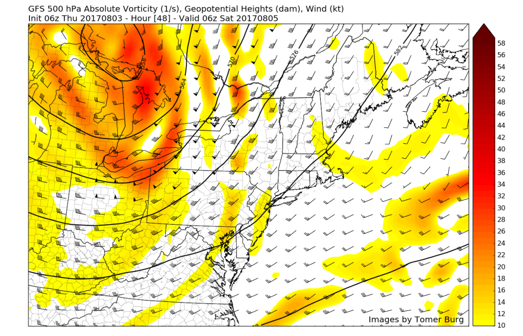 For the coastal plain, including much of the I-95 corridor from Boston to Philadelphia, some scattered showers and thunderstorms may occur sometime Friday night into Saturday, as the frontal boundary moves through region. But the best shear and forcing will passing with more energy further northwest. Instability will also be reduced somewhat by an onshore south-southeast flow. So for these reasons we don’t anticipated organized severe weather and widespread heavy rainfall for these areas. The amount of shower and thunderstorms may also be reduced in coverage and intensity, if frontal timing is late Friday night or early Saturday, with typically lower diurnal instability.