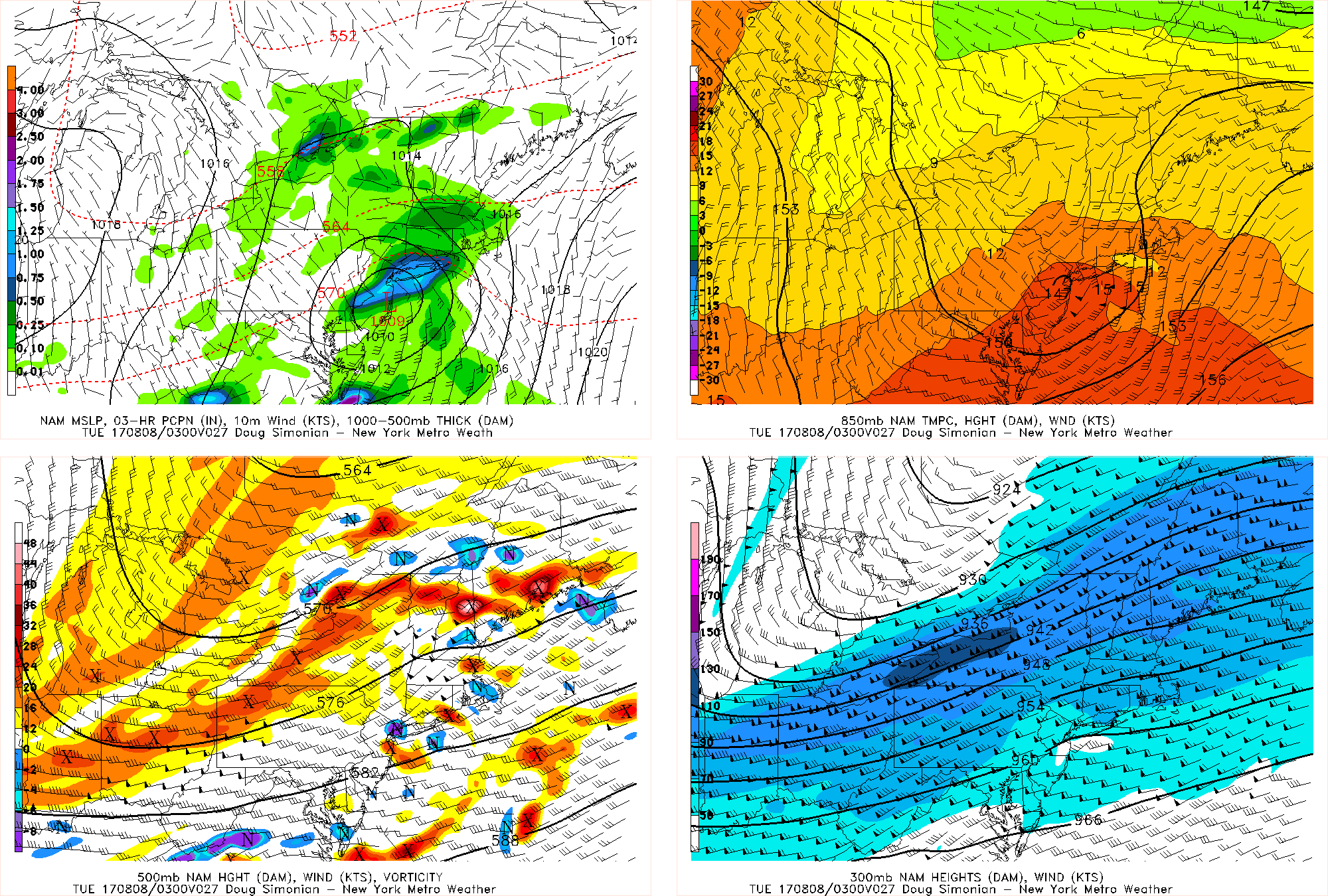 NAM model showing sheared out 500mb voritcity with the shortwave through and in 300mb jet streak running north of the Mid-Atlantic region, as low pressure deepens at the surface.