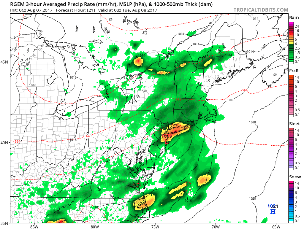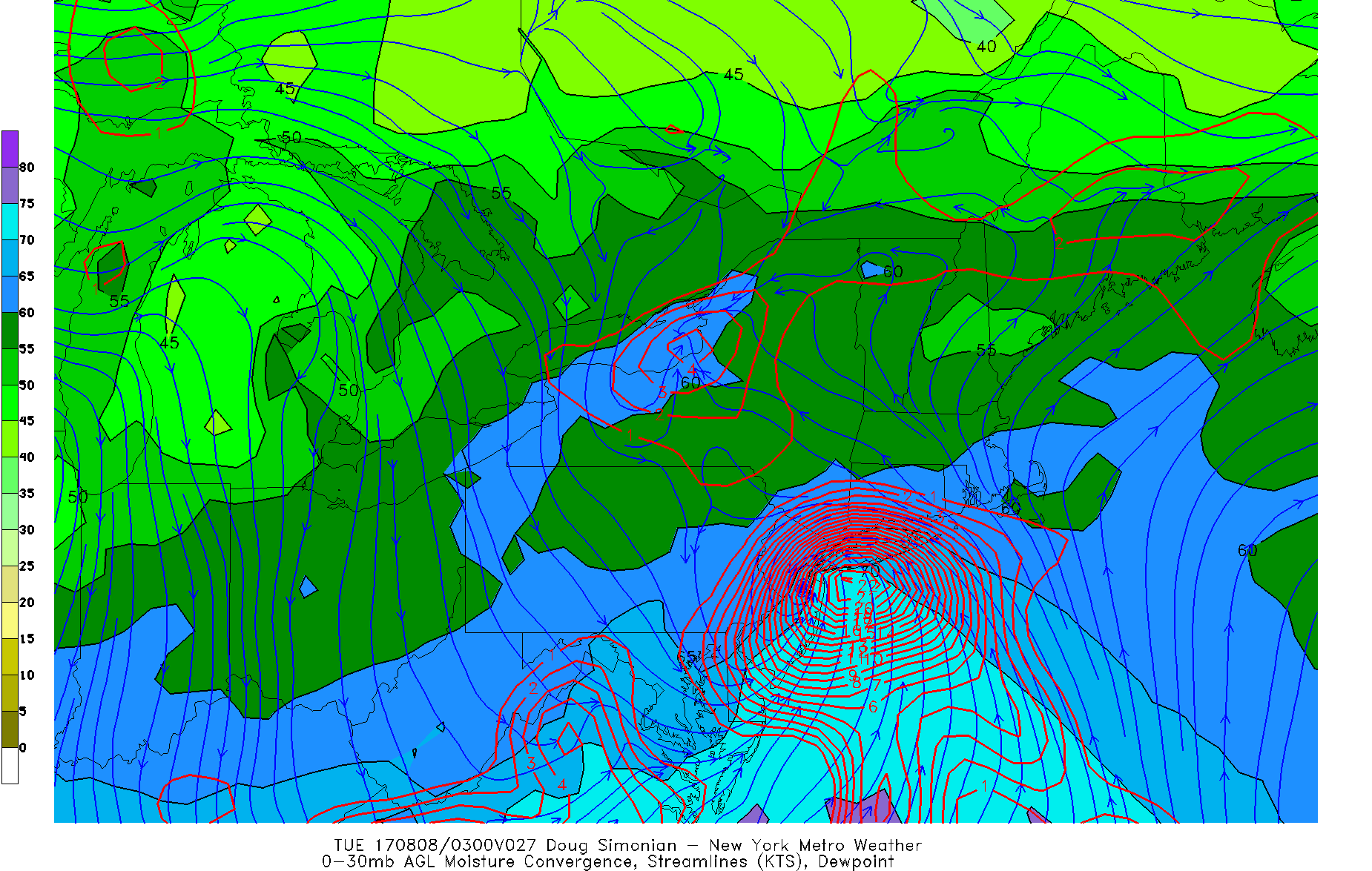 Model guidance indicates, a sub-tropical plume of moisture will moving northward with precipitable water values nearing or going over 2.00″ by this evening. This could support torrential downpours with heavy rainfall totals and localized flash flooding in some spots. Therefore the National Weather Service has issued Flash Flood Watches for parts of the region, including the New York City and Philadelphia metro areas. At this time, we are anticipating parts of these regions to receive between 1″ to 3″ rainfall by tonight. However, due the aforementioned factors, there is still some uncertainty where the placement of best dynamics and moisture will be for heavy rainfall. There also tendency for heaviest rainfall to occur north of the highest precipitable water values, where there is more lift from moisture convergence. Therefore, confidence is lower than usual, on amount of rainfall over parts of the region.