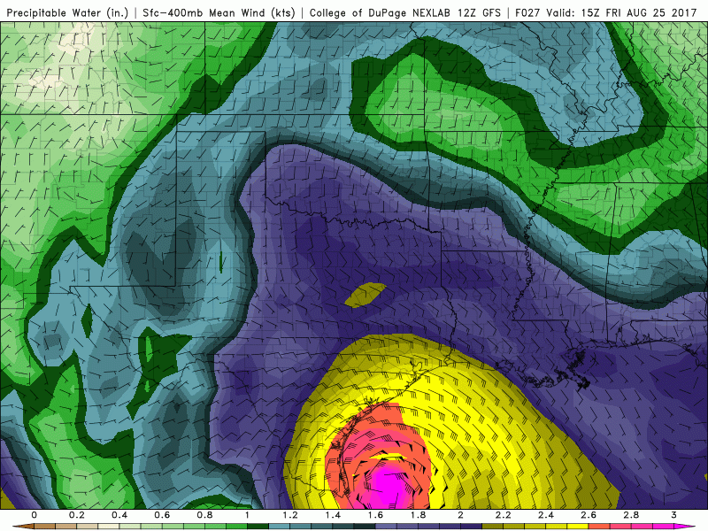 Today’s 12z GFS shows a very prolonged, tropical moisture fetch extending from the entire Gulf and right into Harvey. This results in several days of extremely heavy rain (NEXLAB).