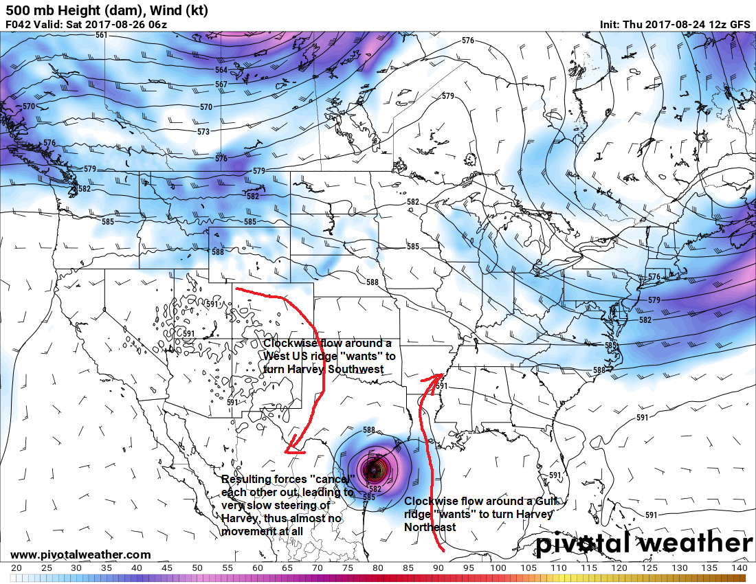 500mb analysis shows competing steering mechanisms from two different ridges, thus a resultant very slow movement of Harvey (Pivotal Weather).