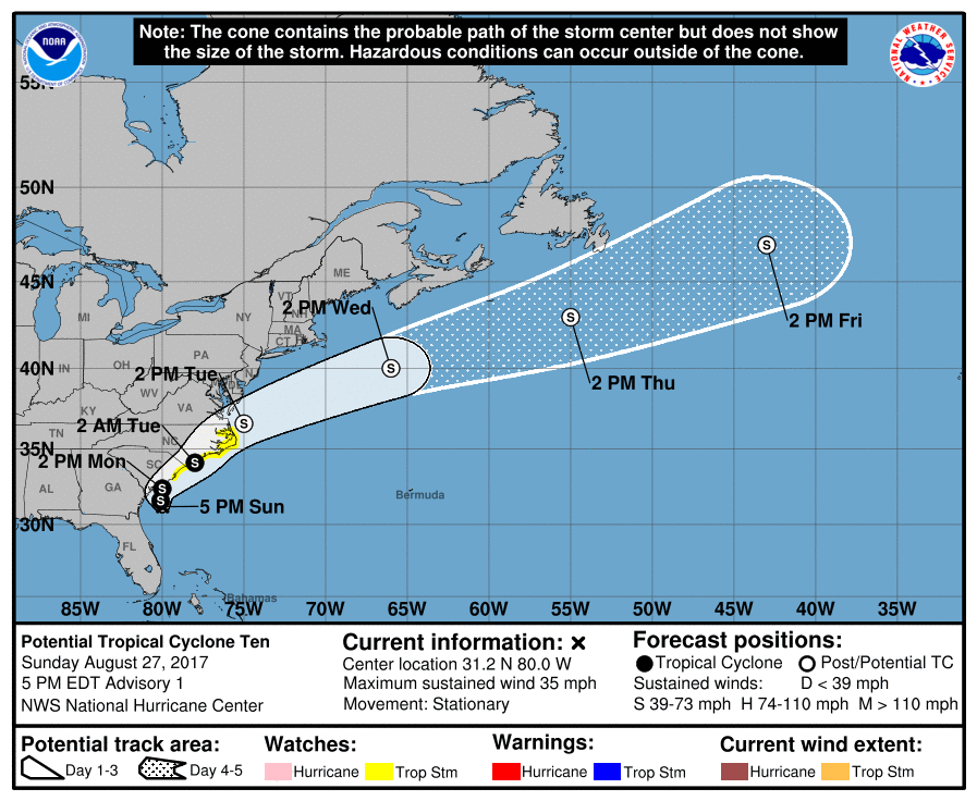 Plenty of attention has been on Harvey this weekend making landfall as a major Category 4 hurricane near Rockport, Texas, and then causing catastrophic flooding in and near the Houston Metropolitan area. This will likely not change over the next several days, as Harvey continues to meander over South Texas, dumping waves of heavy rainfall. But another storm is beginning to take shape off the Southeast Coast. This storm has been classified by the National Hurricane Center as Potential Tropical Cyclone Ten, which was previously invest 92L that was followed since it was way out in the Atlantic. Wind shear and dry air over much of the Western and Central Atlantic had kept this system from organizing. However, this system has become better organized just off the South Carolina and Georgia coasts this afternoon.