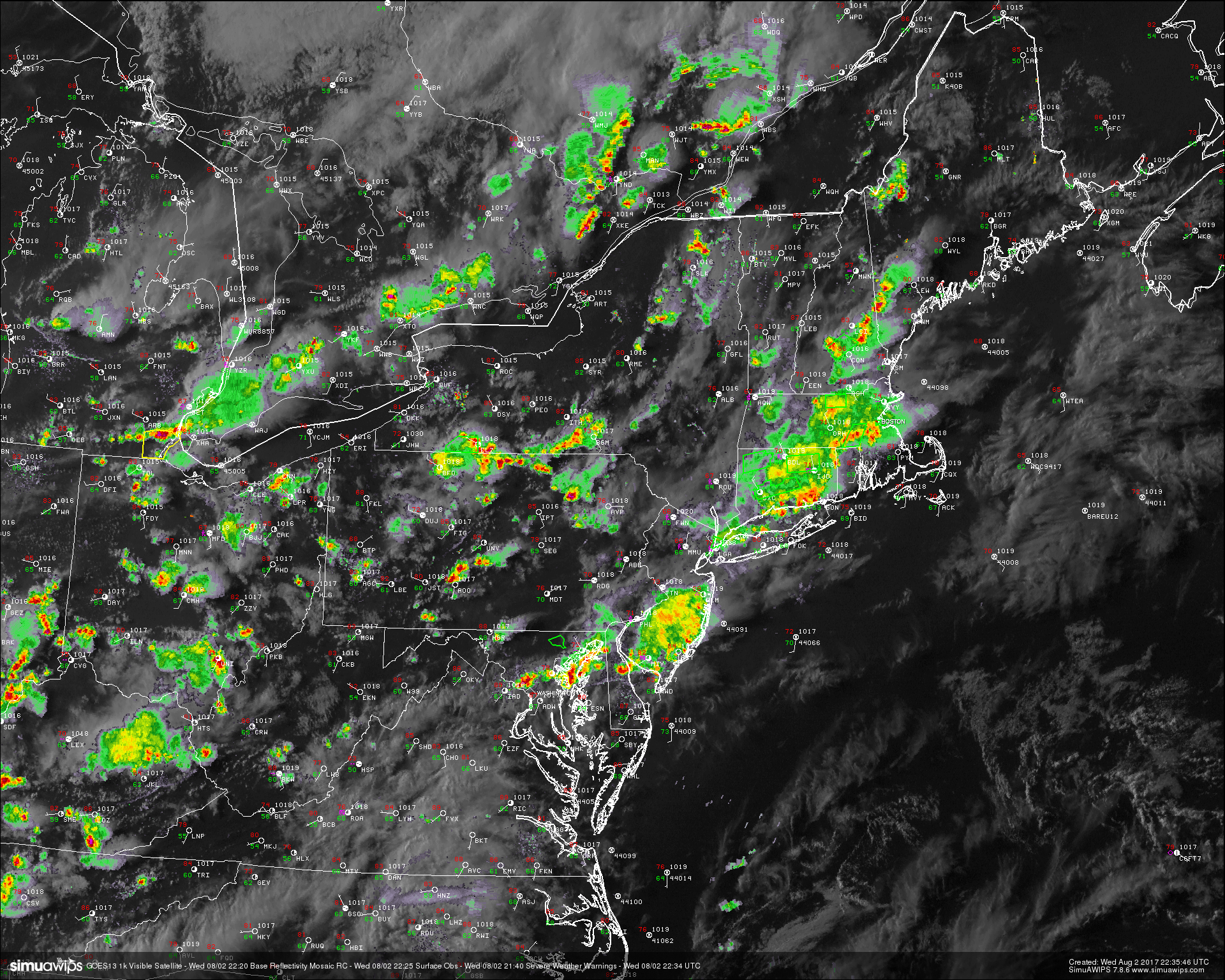 This evenings latest regional radar. high resolution visible satellite, surface observations. and severe warnings, showing the bulk of the heavy rain dying off. This trend should continue as we head deeper into the evening (Courtesy of Simuawips)