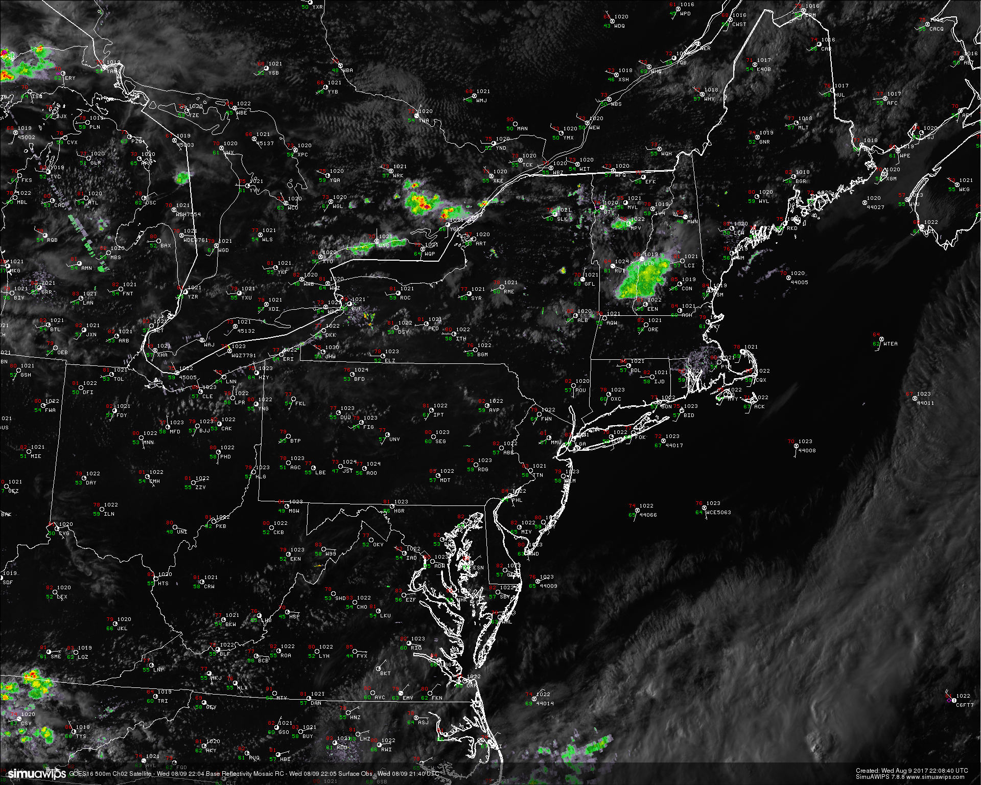 This evenings latest high resolution 500m GOES 16 visible satellite imagery, regional radar mosaic, and surface observations, showing a very pleasant and calm evening across the entire Northeastern region. (Courtesy of Simuawips.com GOES-16 data is preliminary and non-operational)