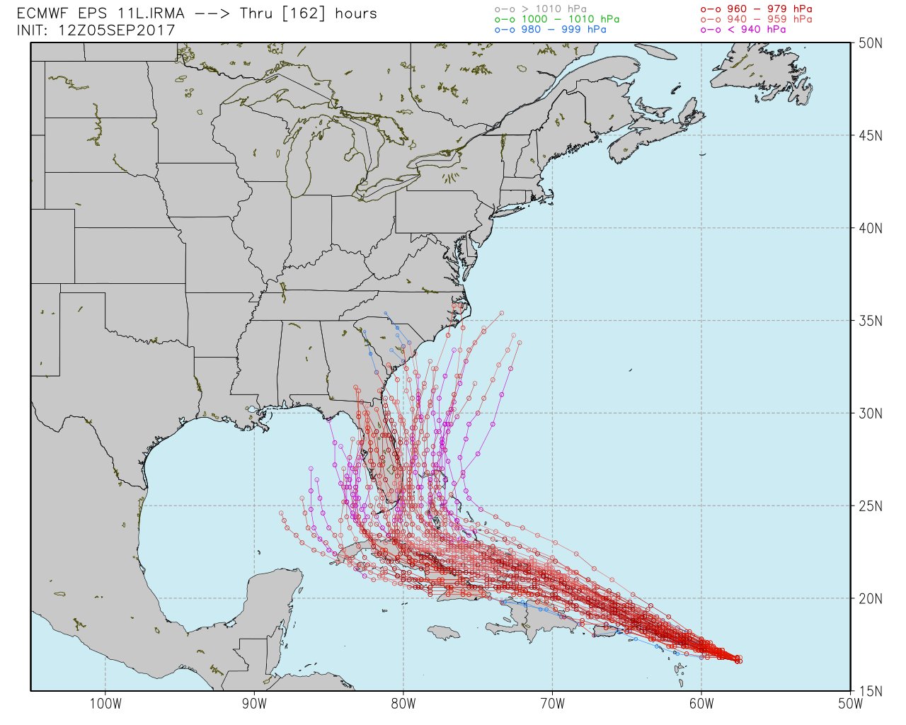 Meanwhile, forecast models suggest a mid level trough will build into the Mississippi Valley later this week. As the ridge over the Atlantic loses its grip, a tug-of-war will develop between the troughing over the Mississippi River Valley and the remnant Atlantic ridging. Exactly when the troughing begins to have a larger impact and steer Irma to the north will be the critical point of the forecast. Eliminating the western and eastern outliers currently suggests the forecast envelope is quite threatening for South and Eastern Florida.