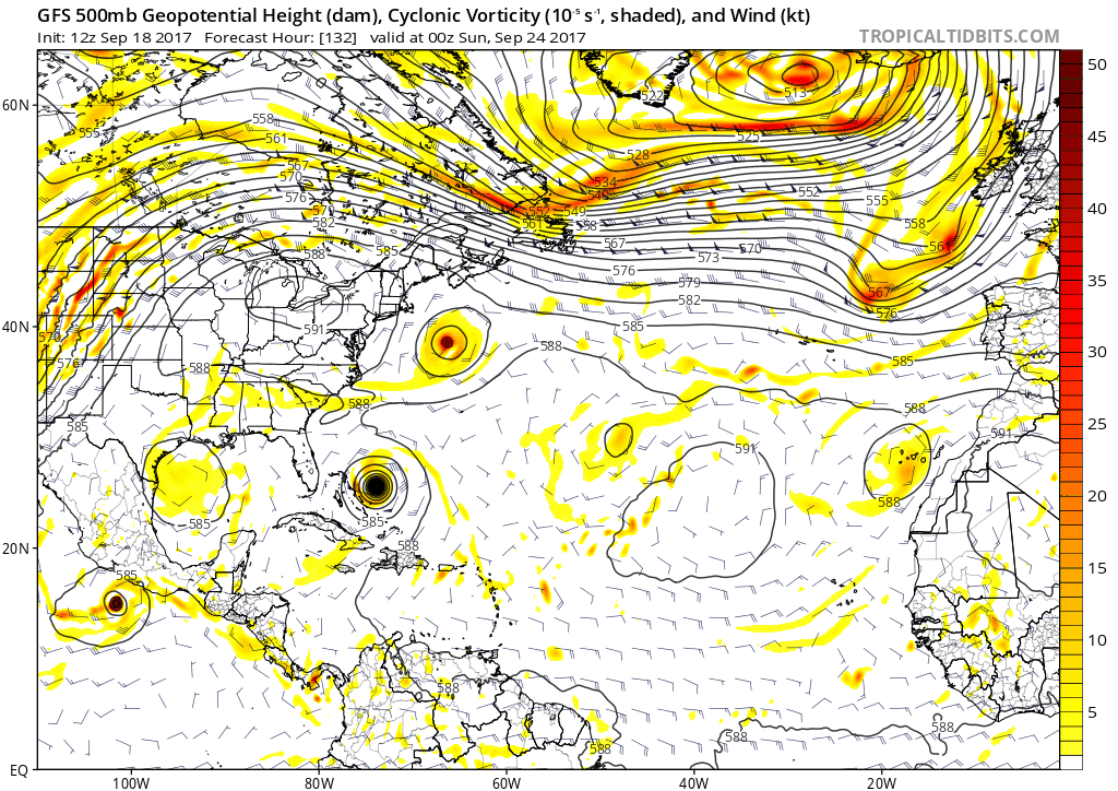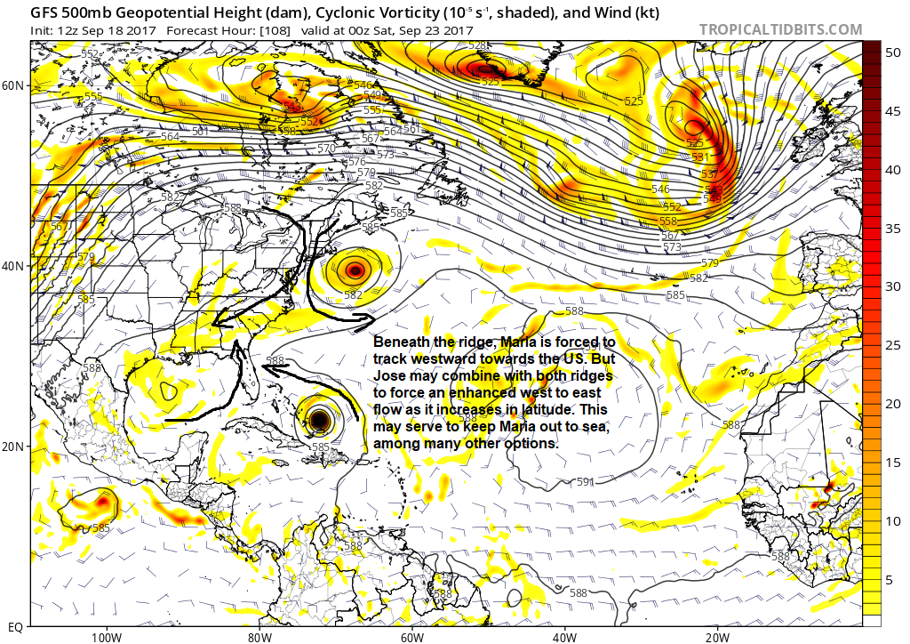 Today’s 12z GFS model valid for Friday evening shows a couple of large ridges initially forcing Maria towards the US, but a large weakness in this ridging via the remnants of Hurricane Jose (Tropical Tidbits).