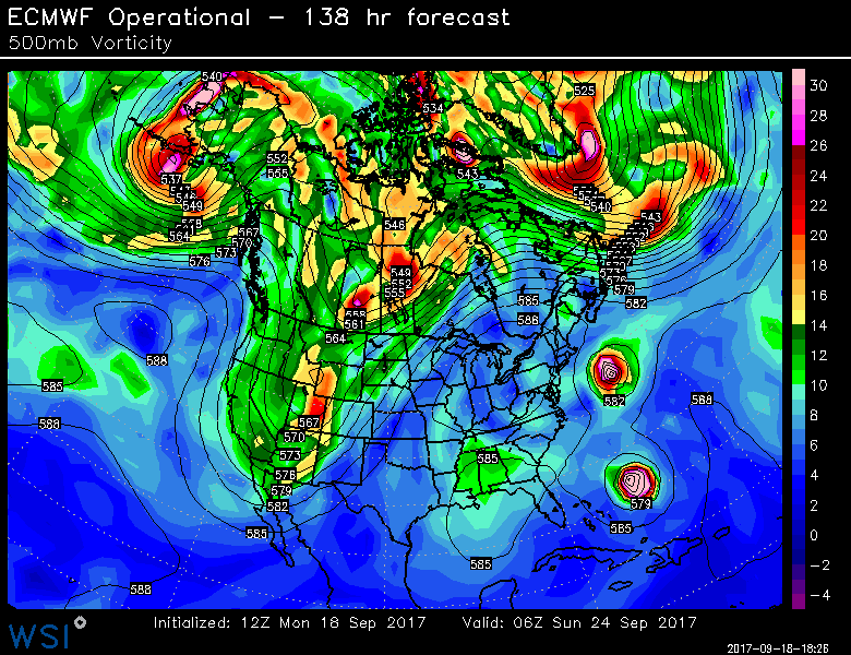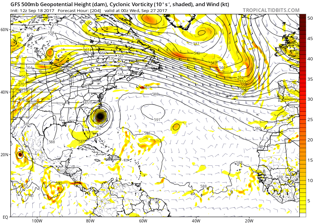 This is illustrated well by today’s 12z GFS, as it shows that when Jose weakens, the ridging becomes the primary steering factor, which allows Maria to track northwest towards the US, despite its forward speed slowing with time. And by the time Maria is close to the US, the trough is still well back to the west, though it is making some progress east, as evidenced by a lot of the downstream ridging moving east.