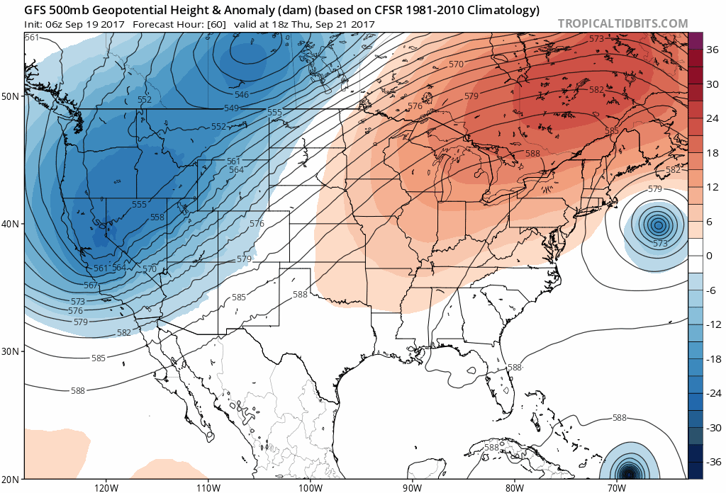 GFS model showing ridge building into Northeast and Mid-Atlantic region late in the week. While Jose still meanders offshore and Maria begins approaching from east of Bahamas