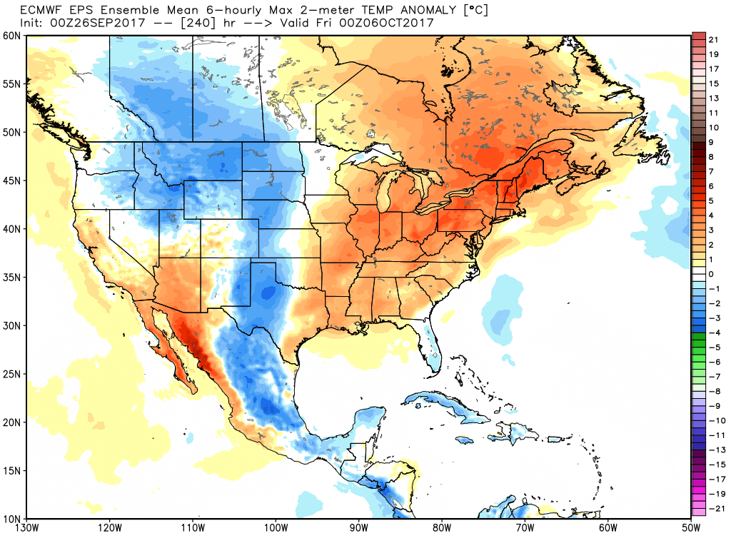 It looks, again, like very warm temperatures will surge into the agriculture regions and eventually the East Coast. This will obviously have a major impact on Harvest and — as it currently stands — it appears that these above normal temperatures could last more than several days, into Mid-October, with the months temperature anomaly/departure from normal running solidly above average for many locations by 10/15.