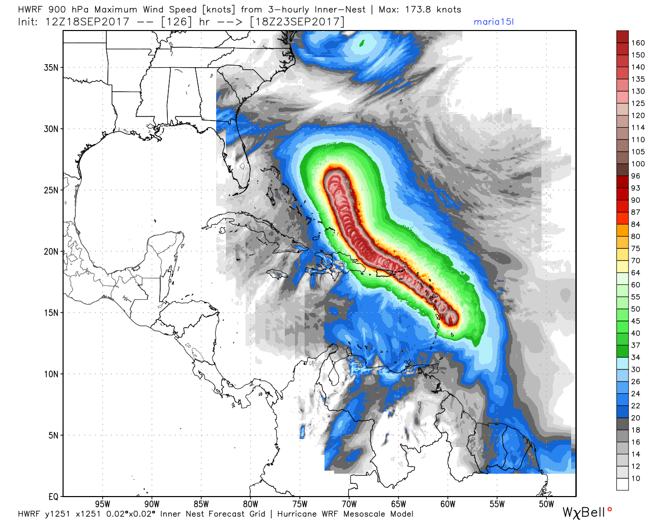 Due to the high, mountainous peak of Dominica and the amount of time that Maria spent traversing the island, the inner eyewall of the storm become disrupted and fractured, but not for long. On Tuesday the storm began to rapidly regain strength after dropping to a Category 4 hurricane. Recon missions throughout the day found that the storm had an incredibly compact eye of around 5-8 nautical miles and the winds rose from 155 mph to 175 mph during the course of the day, with the pressure falling to an incredible 908 millibars, making the storm the tenth strongest on record for the Atlantic basin.