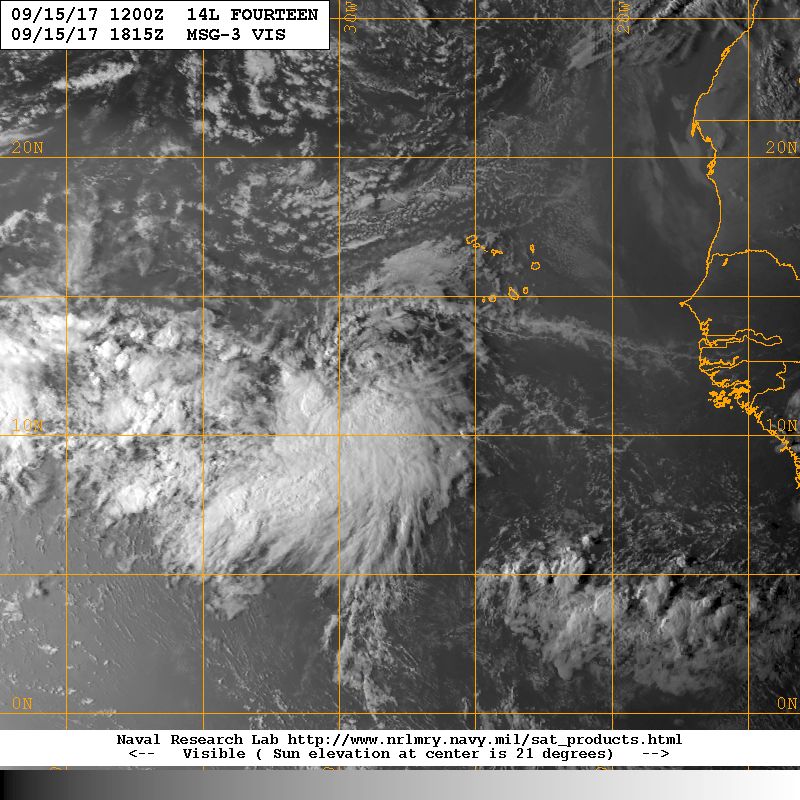 Afternoon visible shot of Tropical Depression 14 over the far Eastern Atlantic