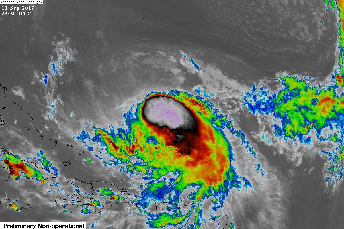 This evenings latest GOES 16 infrared imagery of Hurricane Jose, showing the storm located north of Puerto Rico with very cold cloud tops and a sheared appearance to the system. Jose should track generally north over the next five days or so.