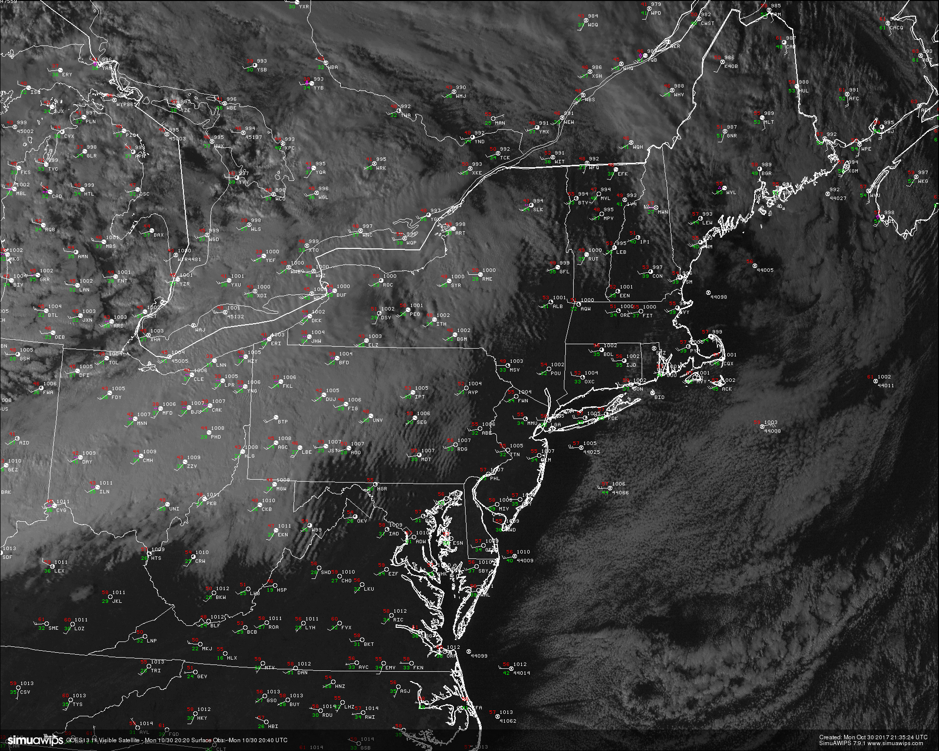 High resolution visible satellite imagery and surface observations over the northeast showing cooling and windy conditions