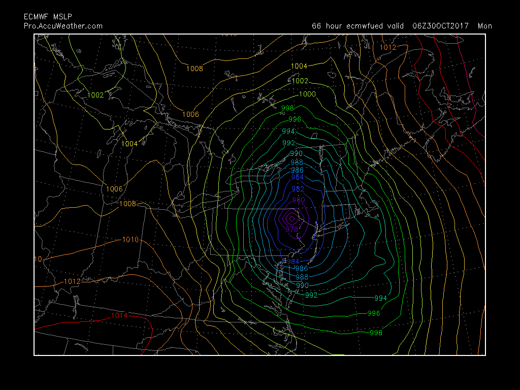 By Sunday evening, the energy in the base of the upper level trough will begin to swing eastward and take on a more negative orientation, which will further promote the development and expansion of precipitation over the Mid Atlantic and Northeast states. This afternoons model guidance has shifted westward and a bit stronger with the overall system, indicating that the low pressure area will be located in the vicinity of Atlantic City, NJ by 8pm Sunday. This scenario would lead to very heavy rainfall rates over the entire Northeast, with strong, gusty winds from the east also increasing through the evening. This afternoons European ensembles, which is a blend of 51 models with different initial conditions shows that the low will then take a track to the NNW into New Jersey, and then Pennsylvania by late Sunday night and into the early morning hours of Monday. The storm would likely be intensifying while still heading inland, with the European model showing pressures in the low 970’s-which is common for an Atlantic hurricane. Widespread heavy rainfall and strong winds will likely continue as the low heads inland over portions over southern New York state and finally begins to weaken into the day on Monday.