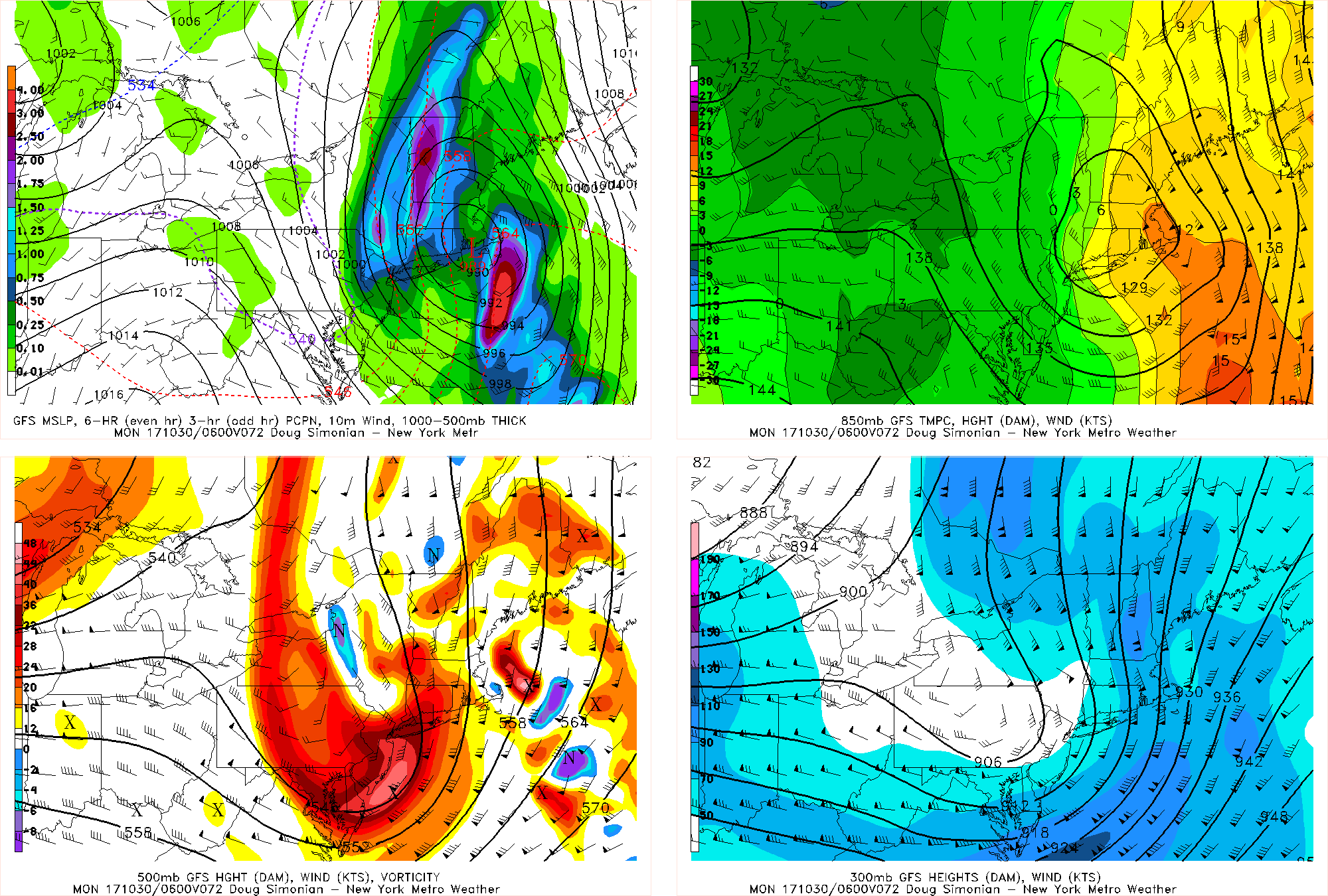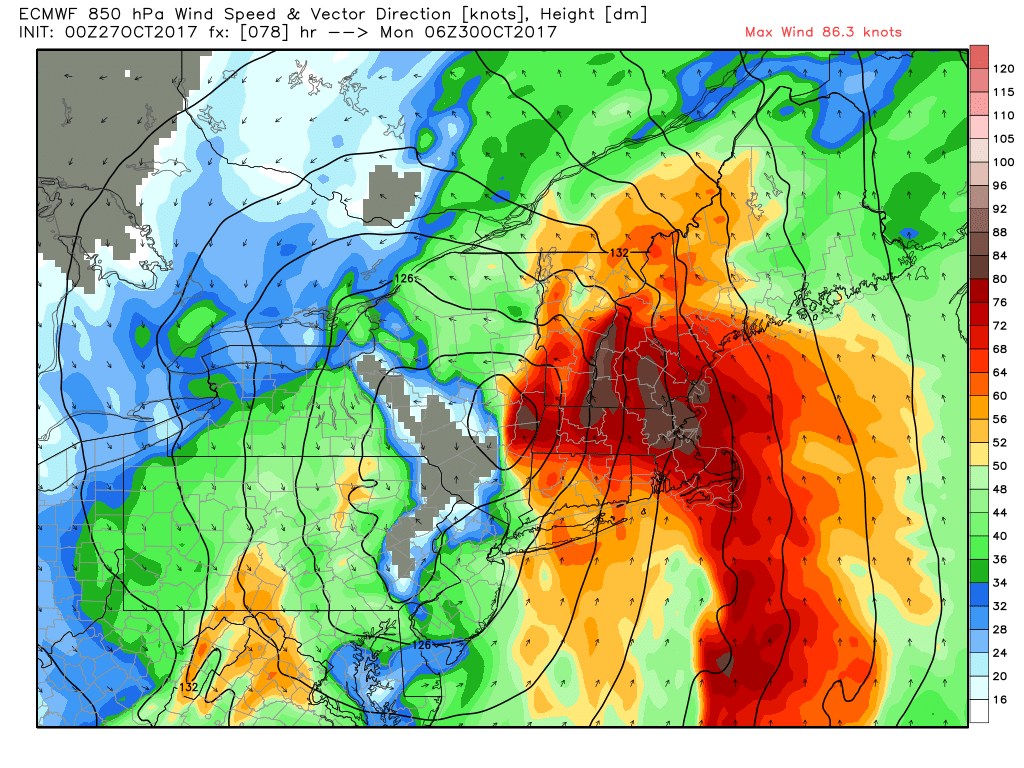 The low pressure system is then expected to tuck northward into Eastern Canada and rapidly deepen – but not before torrential rains (flooding possible in the mentioned areas of New England) and some very strong or damaging wind gusts, possibly over 50mph, in some areas, particularly the New England coasts near Cape Cod and the coastal portions of Maine. There will be with a very strong southeasterly low-level jet with 850mb winds at 80kts or higher. Some potential also exists for strong wind gusts closer to 40mph during and behind the storm system, as the pressure gradient increases over  parts of New York, New Jersey and Pennsylvania from later Sunday night into Monday.