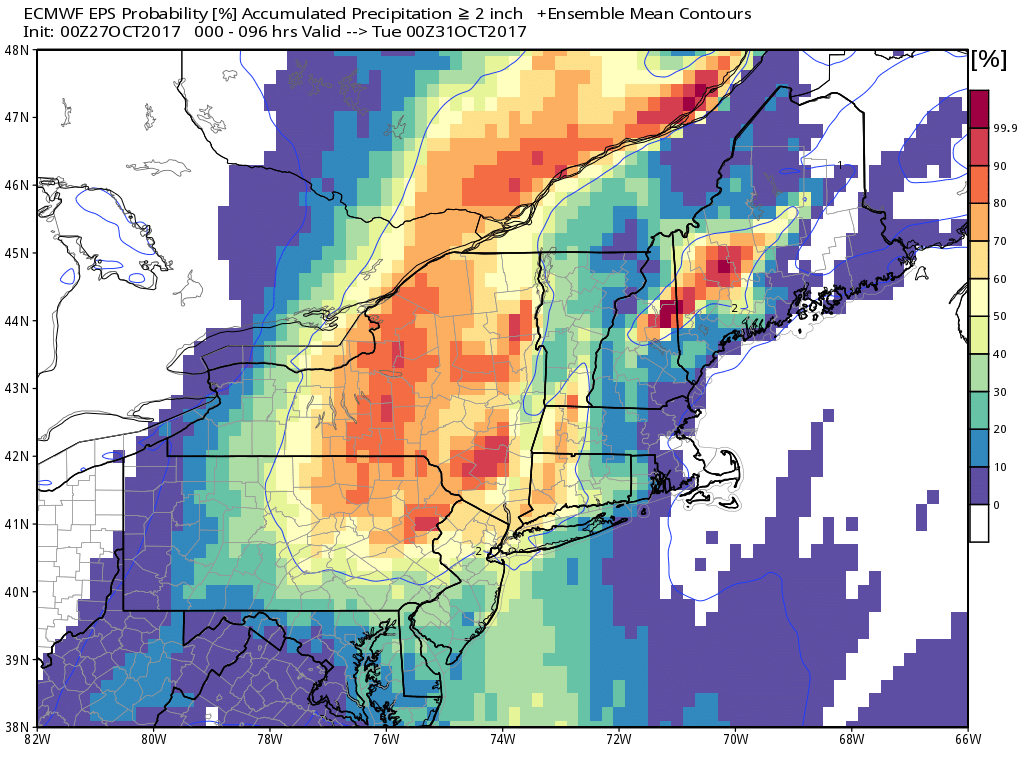 Euro ensembles showing 60%> probabilities of rainfall totals 2.00″ or greater, particularly for Interior parts of the Northeast, through Monday.