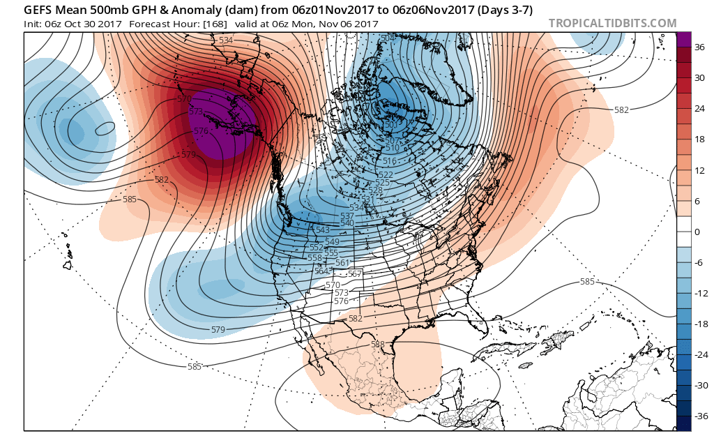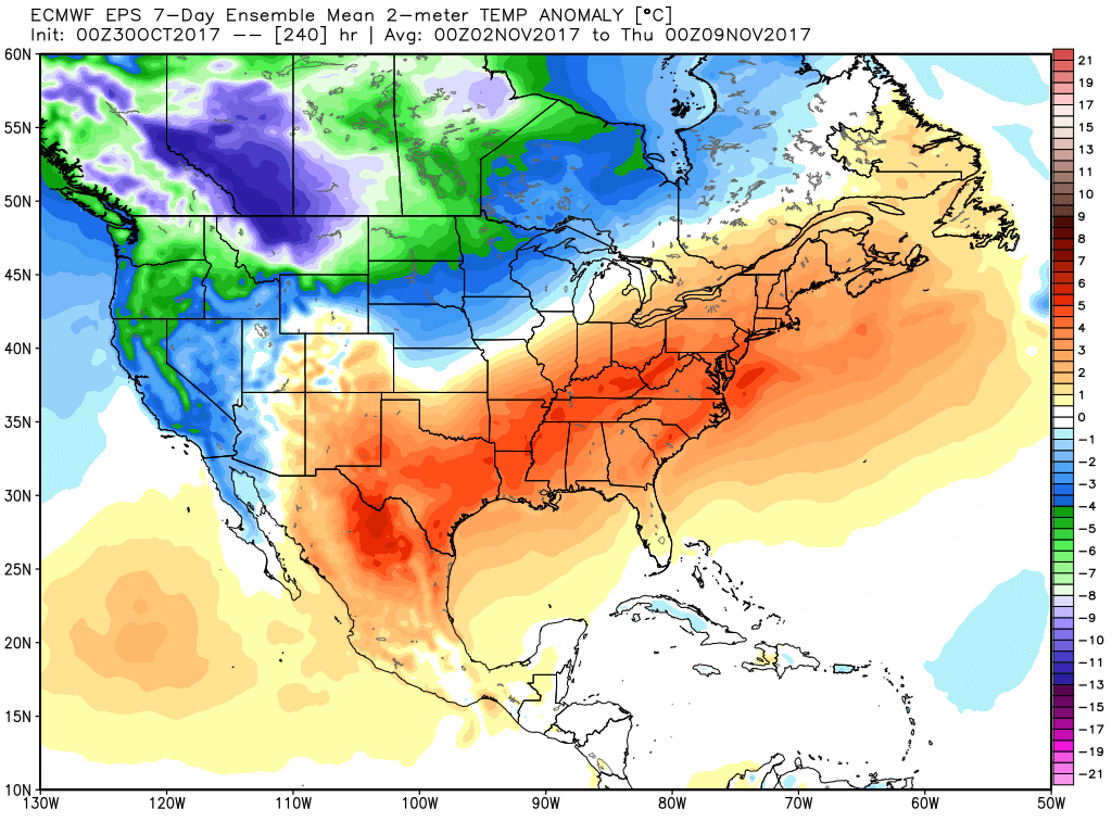 ECMWF ensemble mean showing above normal temperatures on average from the Southern Plains to East Coast, and below normal temperatures on average from the West Coast to Northern Plains during the first 7-10 days of November