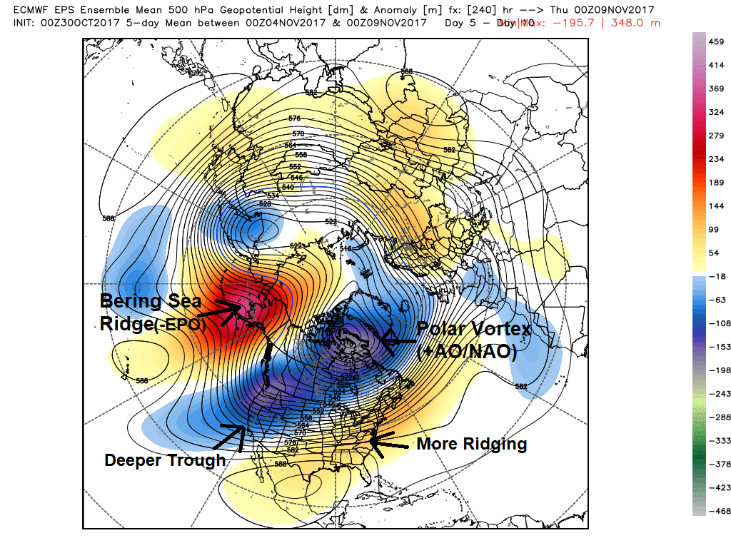 ECMWF ensemble mean showing a negative EPO and positive AO/NAO pattern in the high-latitudes, which support deeper troughiness over Western US and more ridging over Eastern US during the 5-10 day period