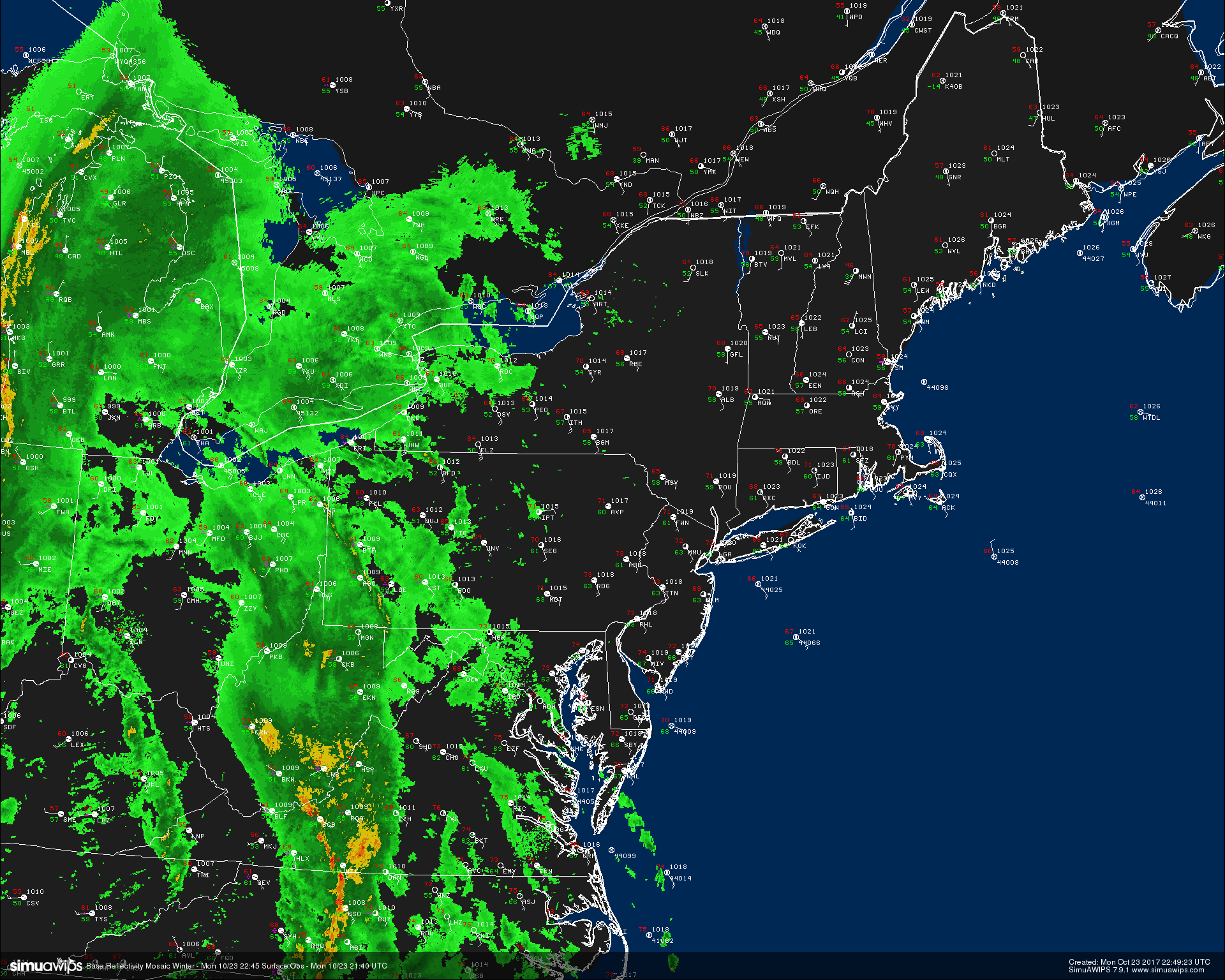 Radar and surface observations from around the Northeast and Mid Atlantic states showing the vigorous Pacific system finally getting ready to impact the region with heavy rain and strong winds.