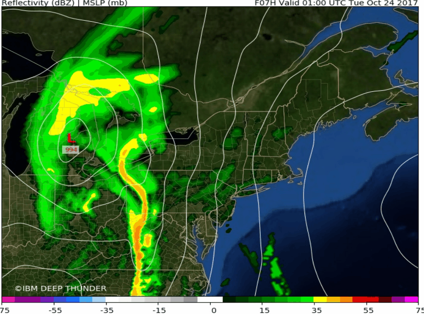 Today was likely the last in the series of nice warm fall days that we have managed to string together over the past five days or so. Mots of the day was rather calm and clear with winds out of the south/southeast, bringing in more moist dewpoints into the area. With mid level temperatures rising ahead of a strong mid level trough located in the central part of the country, we were able to get temperatures to rise into the lower to middle 70’s this afternoon-which is slightly above normal for this time of year. As we progressed into the late afternoon and early evening, mid level clouds began to increase substantially as the vigorous mid level system that we have been talking about since last week began to intensify and pivot towards the east. As of this evening, heavy showers were located in portions of the Mid Atlantic states, and reaching into western Pennsylvania. This heavy shower activity is being fueled by a strong upper level jet in conjunction with an impressive low level jet, working to transport deep tropical moisture northward into the East. As we continue into the night tonight, this activity will likely continue to gradually move northeast, and eventually make its way into eastern Pennsylvania around 5am or so. By this time, moisture transport from the source region of the Caribbean will be maximized, and the upper level jet over-top this anomalous moisture will be to expand and promote surface convergence, which will promote heavy/intense rainfall to develop. High resolution model guidance disagrees on the exact evolution of these features, but signs point to possible low-topped convection forming over eastern Pennsylvania and quickly heading northeast into the NY metro.
