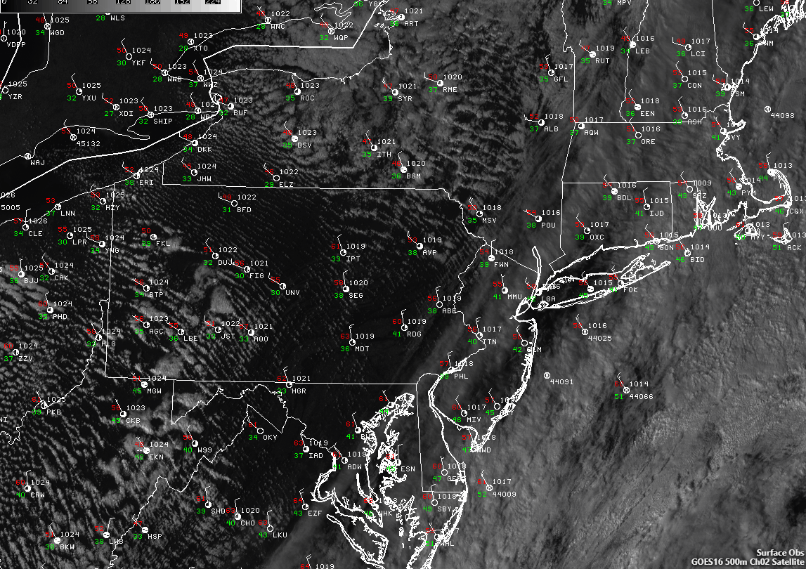A cold front moved through sections of the Northeast late last night, bringing areas of showers, gusty winds, and more importantly a sizable airmass change. Within a period of only a few hours, the cold front knocked us into more autumnal conditions, with dewpoints dropping from the unusually high low to middle 60’s, back into the low 30’s-leading to a much more crisp feeling to the air today. Additionally, cooler temperatures aloft have left the entire area with much cooler highs as well, with most of the Northeast seeing highs in the middle 50’s to lower 60’s, with even a few areas in Pennsylvania and New York seeing temperatures stuck in the upper 40’s. Conditions have also become quite windy across the area behind the cold front-with many stations reporting northwesterly winds gusting in the 20-30 mph range through the afternoon and into the early evening hours. This northwesterly flow has also worked to bring in cooler air over the relatively warm Great Lakes, which has generated some lake-effect clouds this afternoon that has mainly been focused over New York state, with some low-topped cumulus clouds over Pennsylvania. Further east over the metro area, we’ve seen a mix of sun and clouds over the area as some trailing upper level cirrus clouds quickly move from southwest to northeast on the eastern side of the upper level trough.